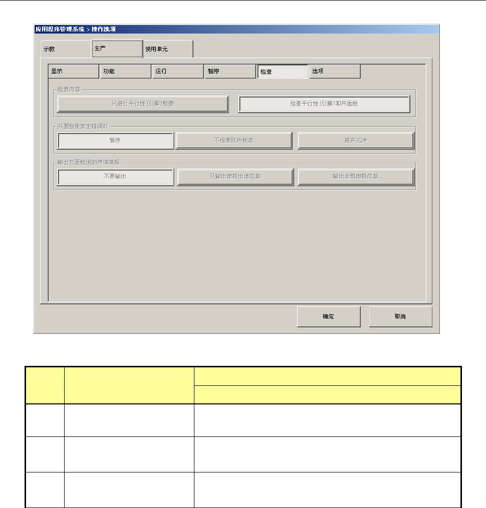 第2部 功能详解篇 第 6 章 操作选项 6-16 序号 项目 内容 状态 动作及详细内容 7 暂停对话框中显示 [ 补 充元件 ] 按钮 设置生产暂停时对用完的元件进行补充的功能。 生产暂停时画面上出现 [ 补充元件 ] 按钮。 元件用完时和标记识别 错误暂停时画面上不带 [ 补 充元件 ] 按钮。 按下 [ 补充元件 ] 按钮后, 以供料器(带状、 管状、散 装)元件为对象补充元件。 没有 [ 补充元件 ] 按钮。 8 发生识别…