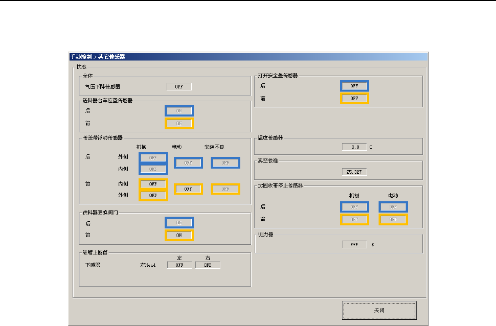 第 2 部 功能详解篇 第 8 章 手动控制 8-54 8-9-5 其他传感器 从菜单中选择 [ 其他 (O)]-[ 其他传感器 (O) ] ,或选择命令按钮中的 [ 其他传感器 ] 后,可显示其他传感器画 面。 (1) 状态的显示 显示各传感器的状态。 不受机器设置的 “ 使用单元 ” 设置的影响(没有选中(不使用)单元的状态也会显示)。 传感器的状态显示,会连续读入状态和显示。