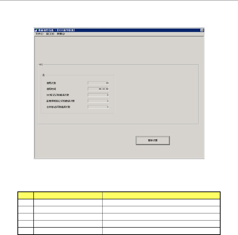 第 2 部 功能详解篇 第 9 章 设备运行信息 9-19 9-4-6 OCC 运行信息 从下拉菜单中点击 [ 窗口 (W)]-[OCC 运行信息 ] , 或从命令按钮中点击 [OCC 运行信息 ] 后, 可显示 OCC 运行信息画面。 (1) OCC No. 项目 内容 1 使用次数 使用 OCC 的次数累计。 2 使用时间 使用 OCC 的时间累计。 3 BOC 标记识别错误次数 发生 BOC 标记识别错误的次数累计。 4 基准领域…