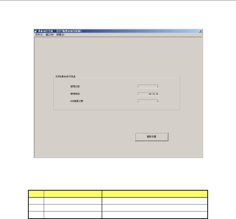 第 2 部 功能详解篇 第 9 章 设备运行信息 9-21 9-4-7 SOT 运行信息(选购项) 从下拉菜单中点击 [ 窗口 (W)]-[SOT 运行信息 ] , 或从命令按钮中点击 [SOT 运行信息 ] 后, 可显示 SOT 运行信息画面。 在 MS 参数中没有设置选项时,不能选择。 (1) SOT 检查台运行信息 No. 项目 内容 1 使用次数 使用 SOT 检查台的次数累计。 2 使用时间 使用 SOT 检查台的时间累计。 …