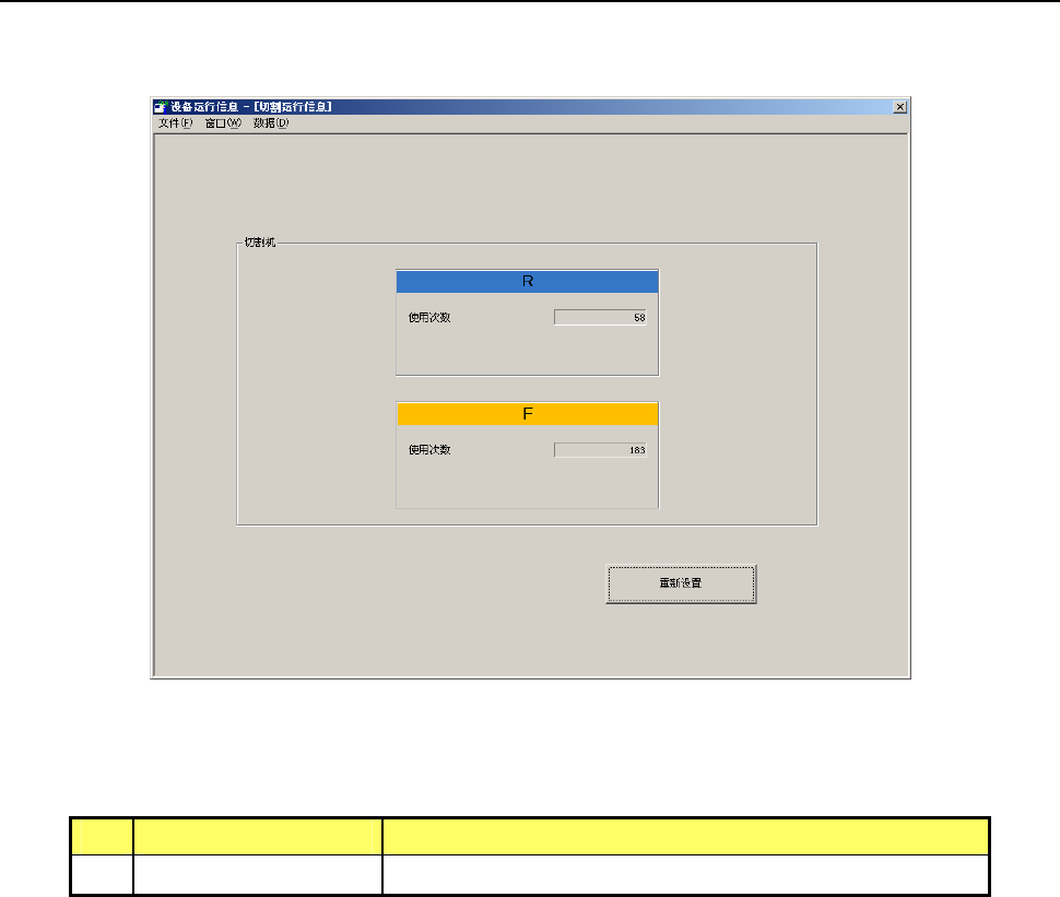 第 2 部 功能详解篇 第 9 章 设备运行信息 9-36 9-4-16 切割运行信息 ( 选购项 ) 从下拉菜单中点击 [ 窗口 (W)]-[ 切割运行信息 ] 后,即显示切割运行信息画面。 (1) 切割运行信息 No. 项目 内容 1 使用次数 切割机开闭动作次数的累计