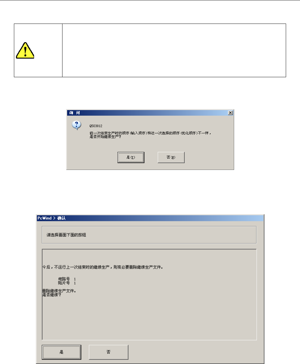 (2) 在可继续生产的状态下,选择不继续生产时,会显示提示,要求确认是否删除继续生产文件。
