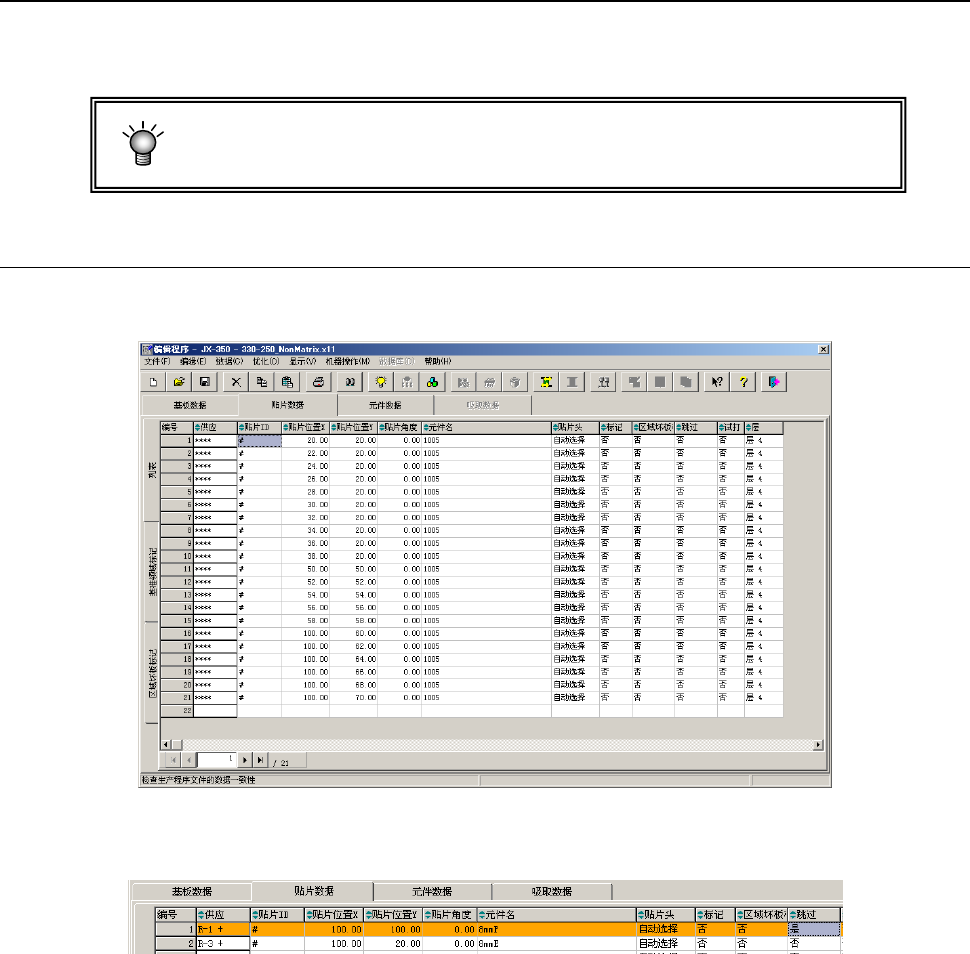 第 1 部 基本篇 第 4 章 制作生产程序 4-42 4-3-4-2 制作贴片数据 输入 “ 贴片 ID” 、 “ 贴片位置 X” 、 “ 贴片位置 Y” 、 “ 贴片角度 ” 、 “ 元件名 ” 。 在其他项目 (Head 、标记、区域坏板标记、跳过、试打、层 ) 将自动输入初始值。 请仅对必要的项目进行变更。 另外, 坐标位置是指从 「基板数据」 中决定的 “ 基板位置基准 (原点) ”( 多电路板时为基准电路的 “ 电路原点 ”…