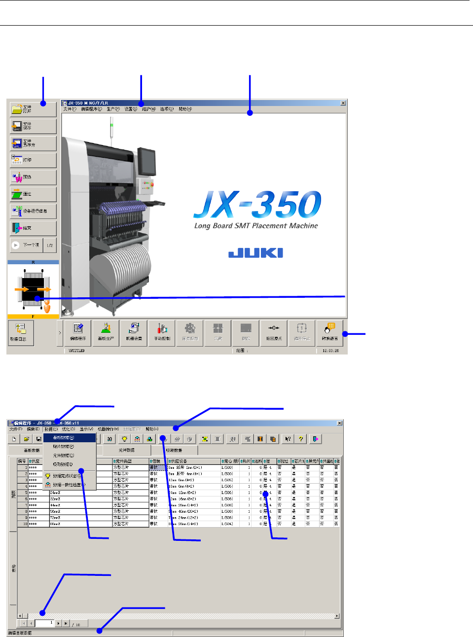 第 1 部 基本篇 第 1 章 装置概要 1-42 画面构成要素及功能概要 要素 功能概要 ①标题栏 视窗的标题。 标题因显示的视窗的功能而异。 ②菜单栏 显示该视窗中可使用的最顶层菜单。 ( 所显示的菜单因视窗而异。 ) 选中某些菜单会出现下拉菜单。 ③下拉菜单 从菜单栏选择菜单时显示的命令一览表。 无效菜单显示灰色。 ④工具栏 用图标显示该视窗中经常使用的菜单。 不同的视窗工具栏的显示 / 不显示可以切换。 只有在程序编辑画面中才可…
