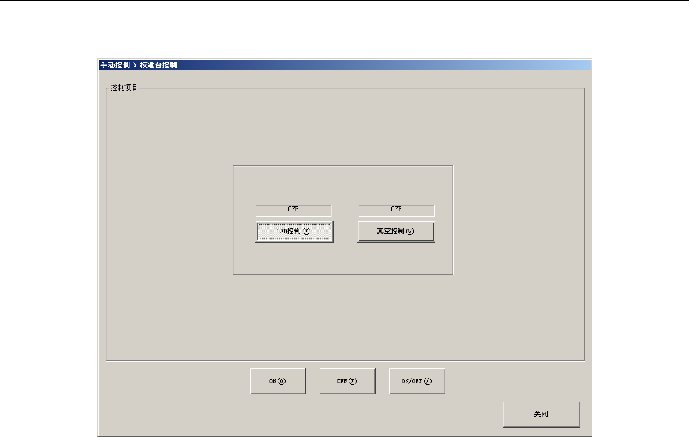 第 2 部 功能详解篇 第 8 章 手动控制 8-52 8-9-3 校准台控制 从下拉菜单中点击 [ 其他 (O)]-[ 校准台控制 (C)] ,或点击命令按钮中的 [ 校准台控制 ] 后 ,可显示校准台控 制画面。 (1) 控制项目 通过单选按钮选择控制项目。 选择 [ON(O)] 按钮、 [OFF(F)] 按钮、 [ON/OFF(/)] 按钮或按下 [F3] 键、 [F4] 键、 [F5] 键来进行控制。 1) LED 控制 控制 …