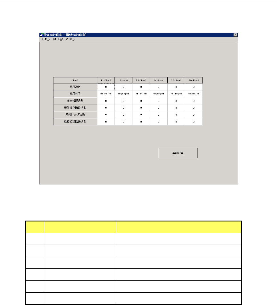 第 2 部 功能详解篇 第 9 章 设备运行信息 9-32 9-4-13 激光运行信息 从下拉菜单中点击 [ 窗口 (W)]-[ 激光运行信息 ] ,或从命令按钮中选择 [ 激 光运行信息 ] 后,可显示激光 运行信息画面。 (1) 激光运行信息 No. 项目 内容 1 使用次数 使用激光的次数累计。 2 使用时间 使用激光的时间累计。 3 激光错误次数 发生激光错误的次数累计。 4 元件站立错误次数 发生芯片站立错误的次数累计。 5 …