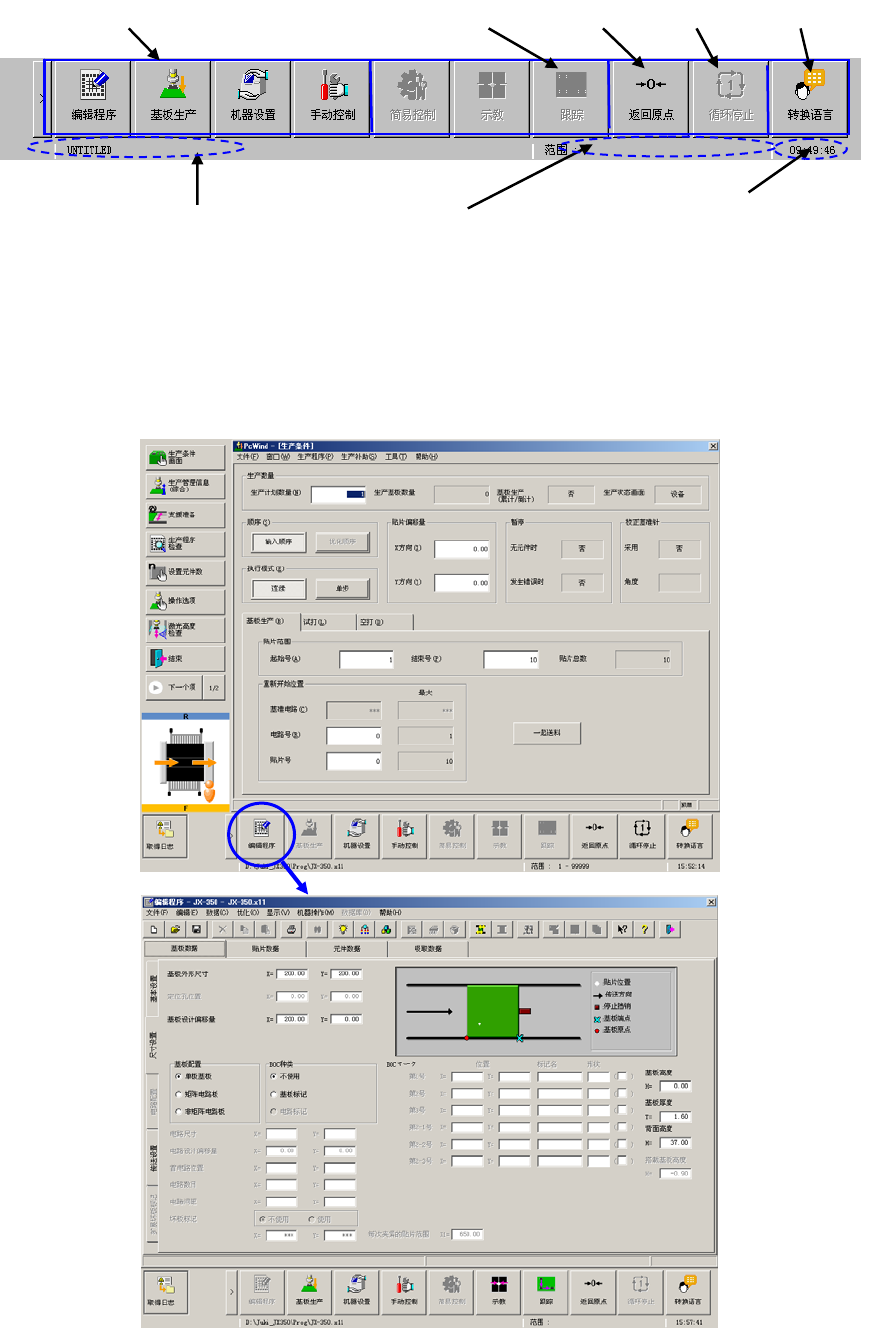 按动程序启动按钮,机器可以快捷地启动和切换编辑、基板生产、机器设置、手动控制、自动校准等