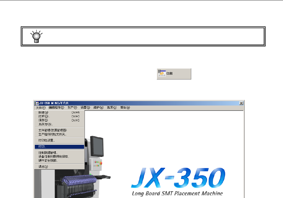 第 1 部 基本篇 第 1 章 装置概要 1-83 1-9-8 打印 打印生产管理信息、装置运行信息、机器设置状态 、或操作选项内容等。 可选择打印或输出文本文件(t xt 格式) 。 要打印,必须安装打印驱动程序。 (参 见 1-9-7 章 ) (1) 打印步骤 ① 「 从菜单选择 文件/「打印」 、或从 命令按钮选择 。