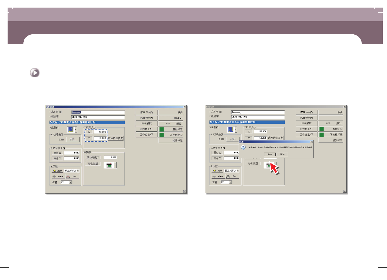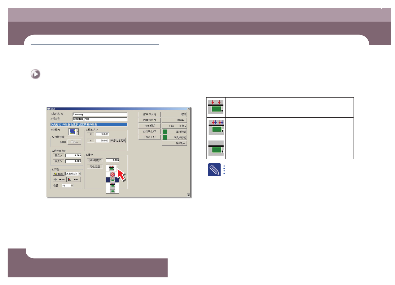 DE CAN L 2 O pe ra tio n H an db oo k 3-1 5 Chap ter 3 本 Chapter 主要介绍生产作业顺序 生产 Advanced Mult i- Func ti onal Place r 准备生产 Ⅱ > 传 送轨道宽度 调节 准备生产 Ⅱ Step 5. 设置 P CB 固 定方式 : 选择 PCB 基 板的夹紧方 式 孔 TA B 向(边缘定位):利用安装在传送装置的装置从侧面夹紧…