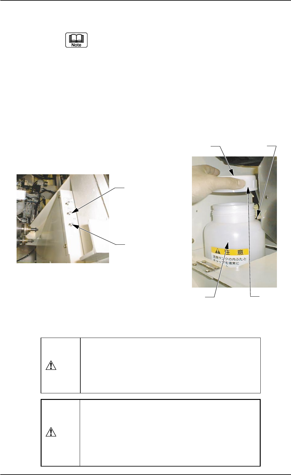 (4) 打开溶剂缸的缸盖和内塞,补充 IPA( 溶剂 ) 。 (a) 在缸内装入溶剂 ( 约 1500 ml 以下 ) ,保持在 Fitting 线下。 (b) 如果溶剂缸和吐出吸嘴间的橡皮管内进入有空气, 可能导致溶剂无法立即被吐出。 用后操作台的溶剂吐出开关操作,吐出少量溶剂并 抽出空气。 (C) 确实拧紧缸盖。缸盖松动会漏入空气,造成无法 充分供给溶剂。并且,也有使缸内塞弹出的危 险。 Fig.5A54 Fig.5A54 Fig.…