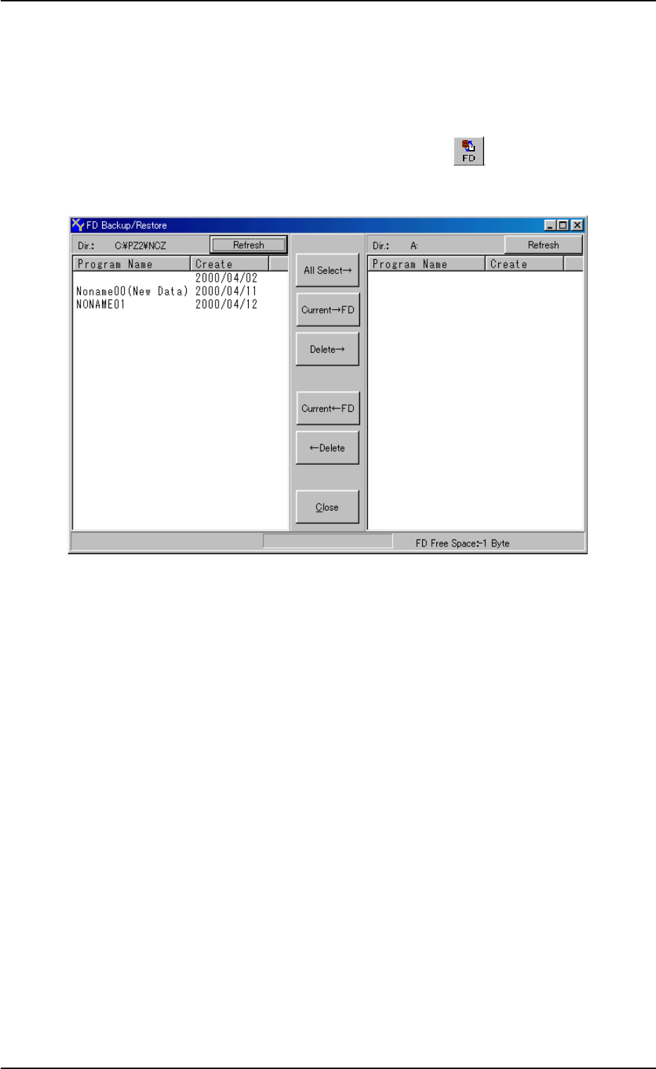 0004-002 1章 2-33 AFQ0 1 JDTP 2. 1 2. 1 2. 1 2. 1 2. 1 界面的操作方法 界面的操作方法 界面的操作方法 界面的操作方法 界面的操作方法 • 选择显示在界面右侧一览的 Pattern Program ,再按 [Current ← FD] 按钮,该 Pattern Program 被复制到装置硬盘。 • 选择显示在界面左侧一览的 Pattern Program ,再按 [Delete ← …