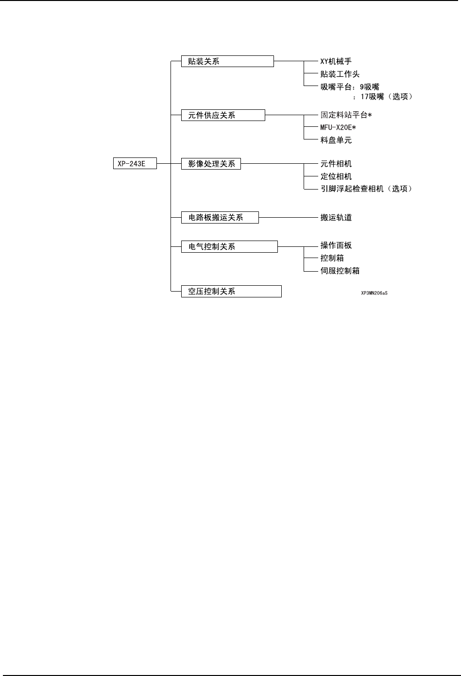 2. 机器主体 MEC-XP243-1.0S 22 XP-243E 机械手册 2.2.3 影像处理关系 元件相机 识别被吸取在吸嘴上的元件形状 和尺寸的照相机。 机器上搭载有 2 台 CCD 照相机。 光源 使用频闪灯的前/侧光方式,有 以下 2 种类型。 定位相机 读取生产电路板的基准定位点, 并进行坐标补正的照相机。 2.2.4 电路板搬运关系 搬运轨道 从机器外部取入生产电路板,贴 装元件后送出到机器外。 2.2.5 电气控制关系…