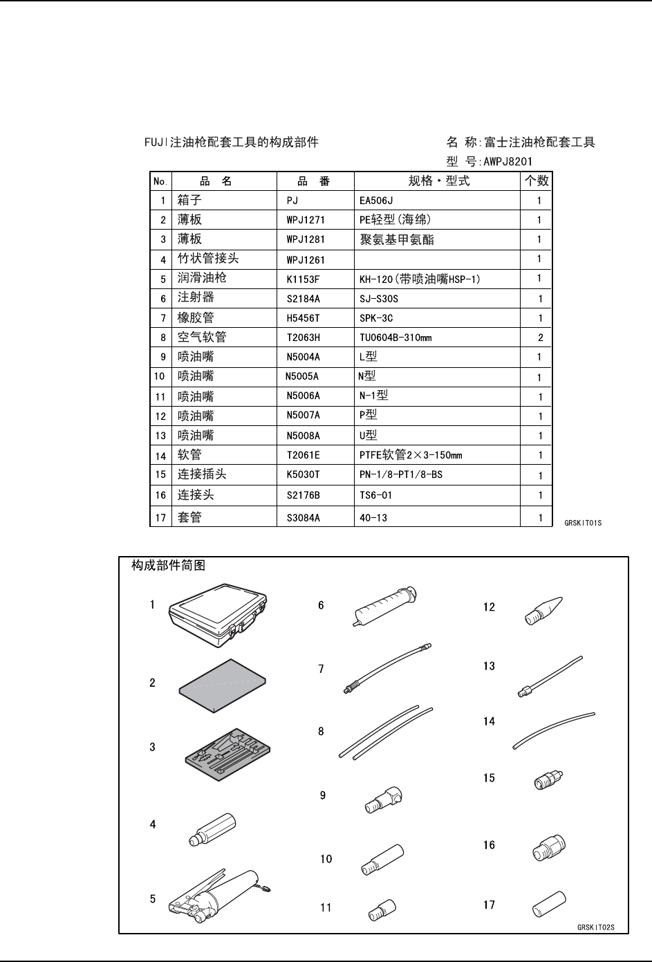 各种润滑油接头相匹配的喷油嘴。因此仅用这套工具就可以方便地在各种地方加油。如果