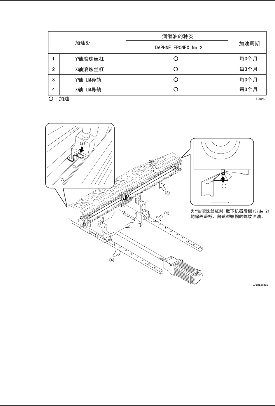 MEC-XP243-1.0S 4. 维修保养 XP-243E 机械手册 41 4.2.4 加油要领 从下一页起介绍各个机器部位的 加油处。加油时请参考各表及插图。 1. 首先请确认插图内的加油处。白箭 头所指处,请用润滑油涂其表面。 黑箭头所指的是喷 油嘴。请用润滑油枪注入润滑油。 备注 ) 不带喷油嘴的 LM 滑块,通过滑块和 LM 轨道之间 ( 轴承槽部 ) 涂抹润滑油,付着在轴承滚珠 或辊子上的润滑油,可润滑 LM 滑块的内部。 …