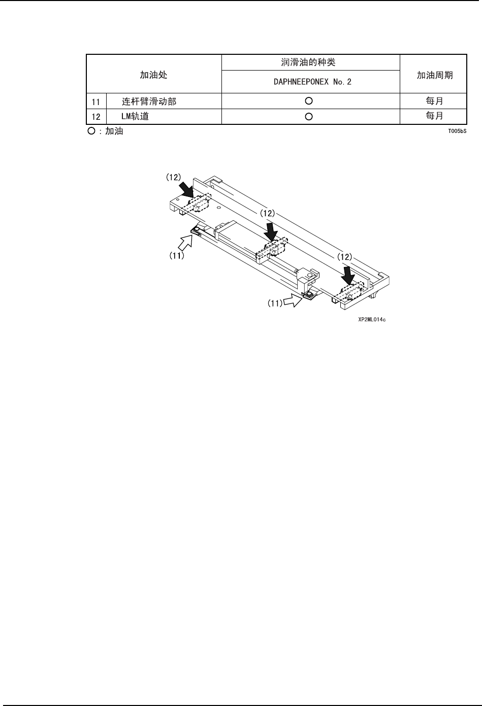 4. 维修保养 MEC-XP243-1.0S 44 XP-243E 机械手册 4.2.7 搬运轨道的加油处 插图内的箭头表示加油处。特别 是黑箭头为必须用润滑油枪加油的 地方。