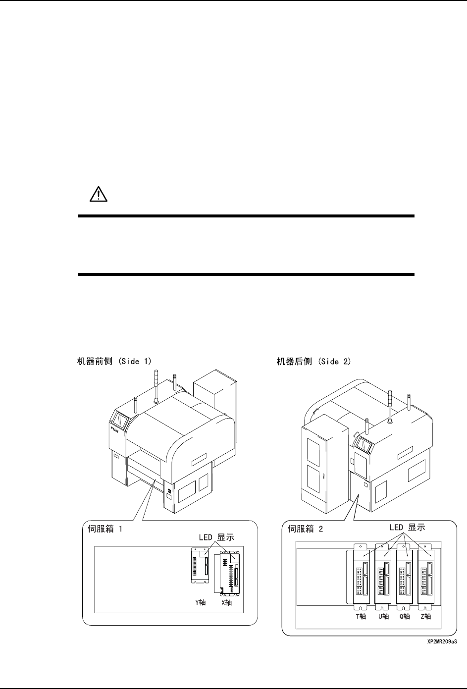 机器的操作画面上显示出 「伺服放大器异常」,伺服放大器前面的 LED 显示 「AL A2」(X