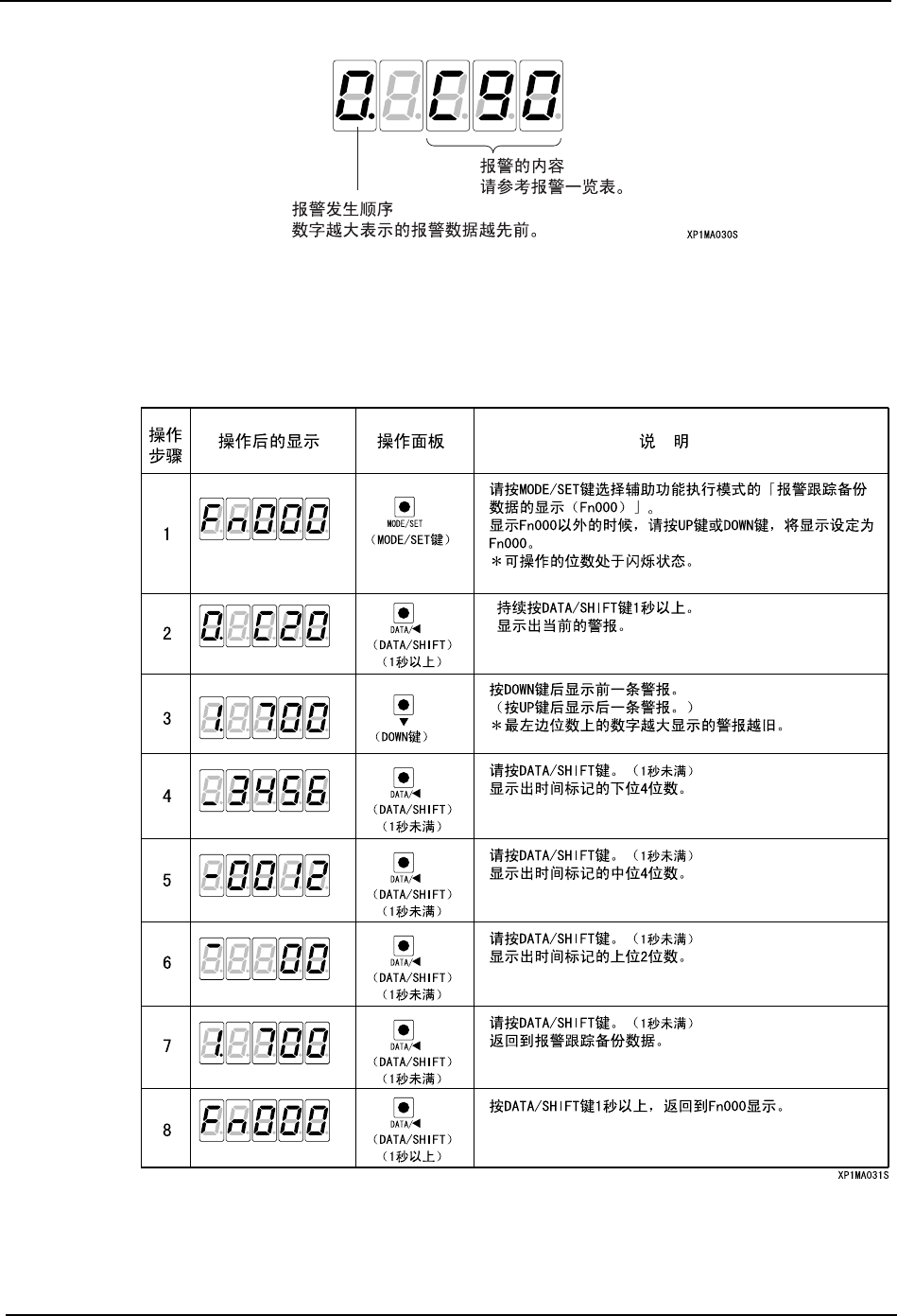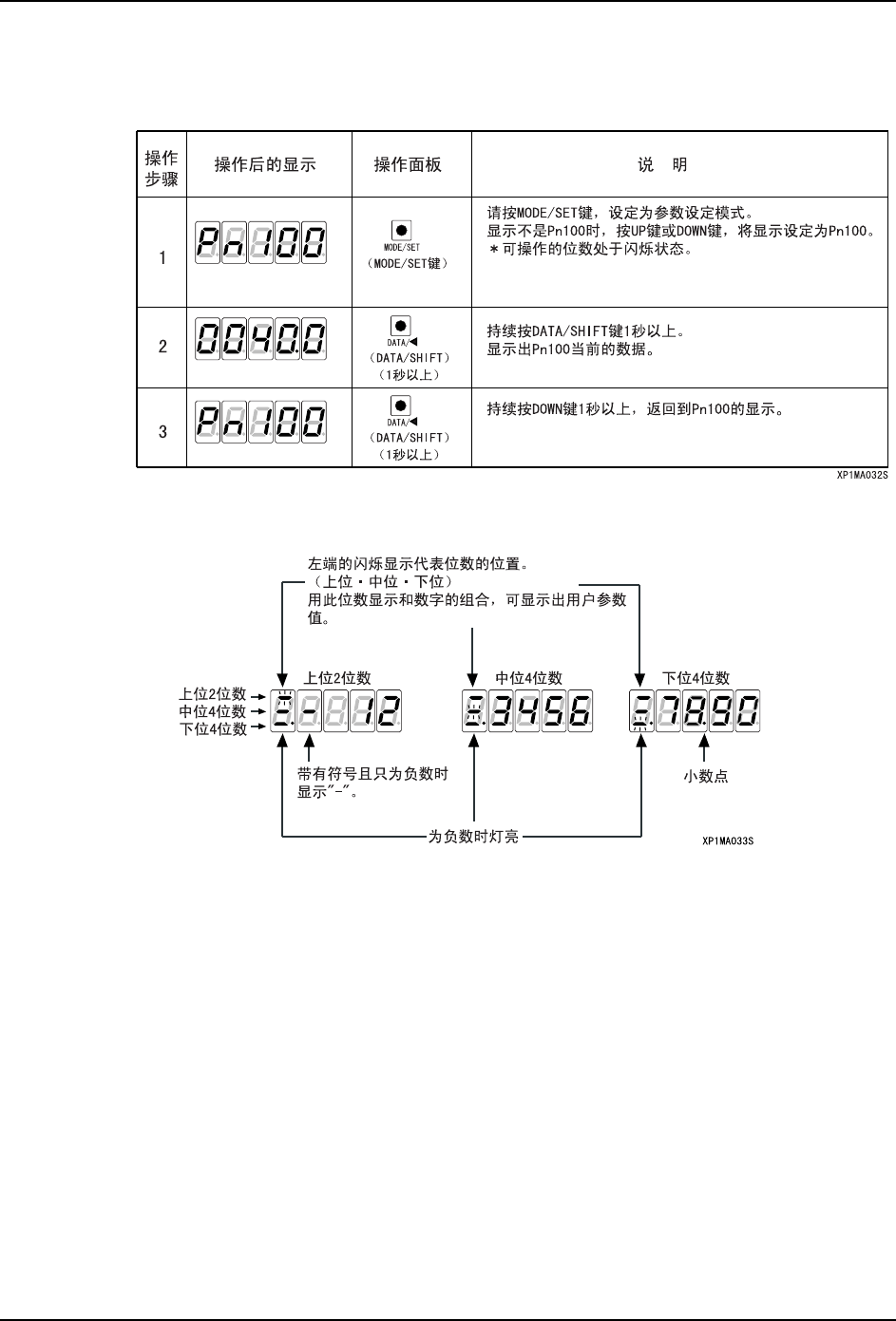 5. 调整 MEC-XP243-1.0S 70 XP-243E 机械手册 用户参数确认模式 (Pn □□□) 1. 利用本功能,能确认用户参数。 2. 操作面板的显示位数为 5 位数。参数为 6 位数以上时如下显示。