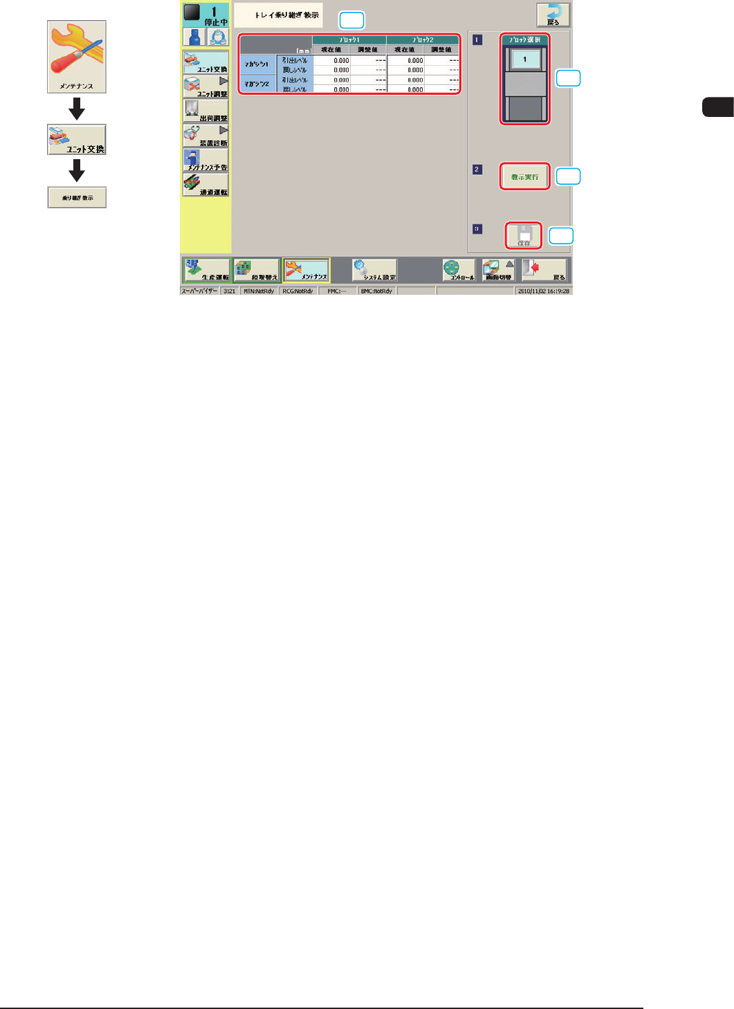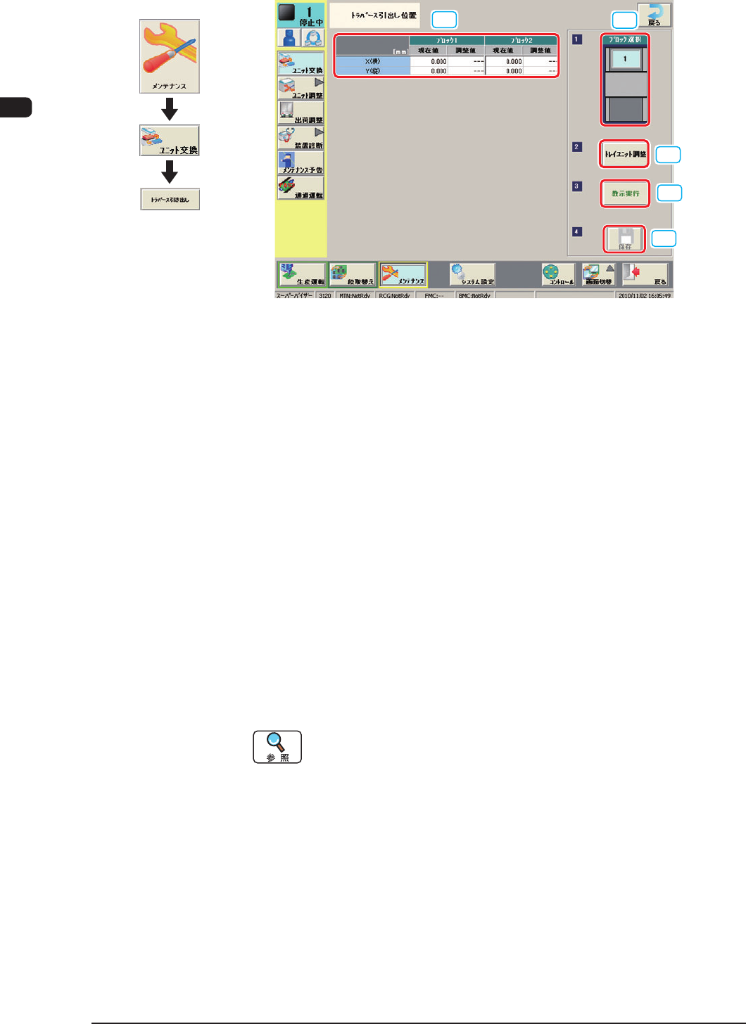 7OM-1601 3-8 3 章 1. メンテナンスメニュー 101 1-003 1.2.3 トラバース引き出し位置 [1] [2] [3] [4] [5] “トラバース引き出し位置” F7C8 [1] ブロック選択 設置されている多段トレイフィーダのブロックを選択できます。 [2] トラバース引き出し位置補正 トラバース引き出し位置の吸着位置補正の値が表示されます。 現在値 : 教示前の値 調整値 : 教示を行った結果です。 [3] …