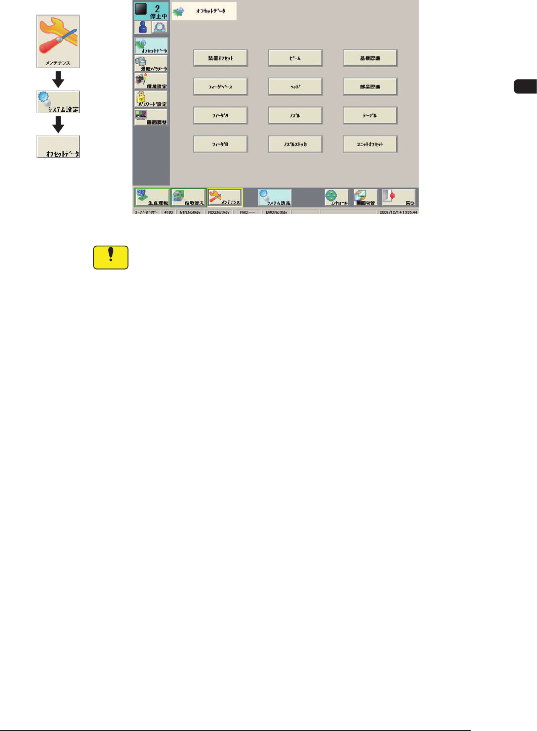 7OM-1601 3-16 3 章 2. システム設定メニュー 0906-001 2.1.1 フィーダ B [1] [2] [3] [5] [4] [6] F7C16 フィーダオフセット B は フィーダのバラツキを補正するデータです。 • X/Y データについては、 自動運転中に部品認識処理 ( ノズル中心と部品中心との位置関係把握 ) され、 部品中心での吸着になるように、 自動的にデータが更新されます。 ( 通常は、データ入力する…