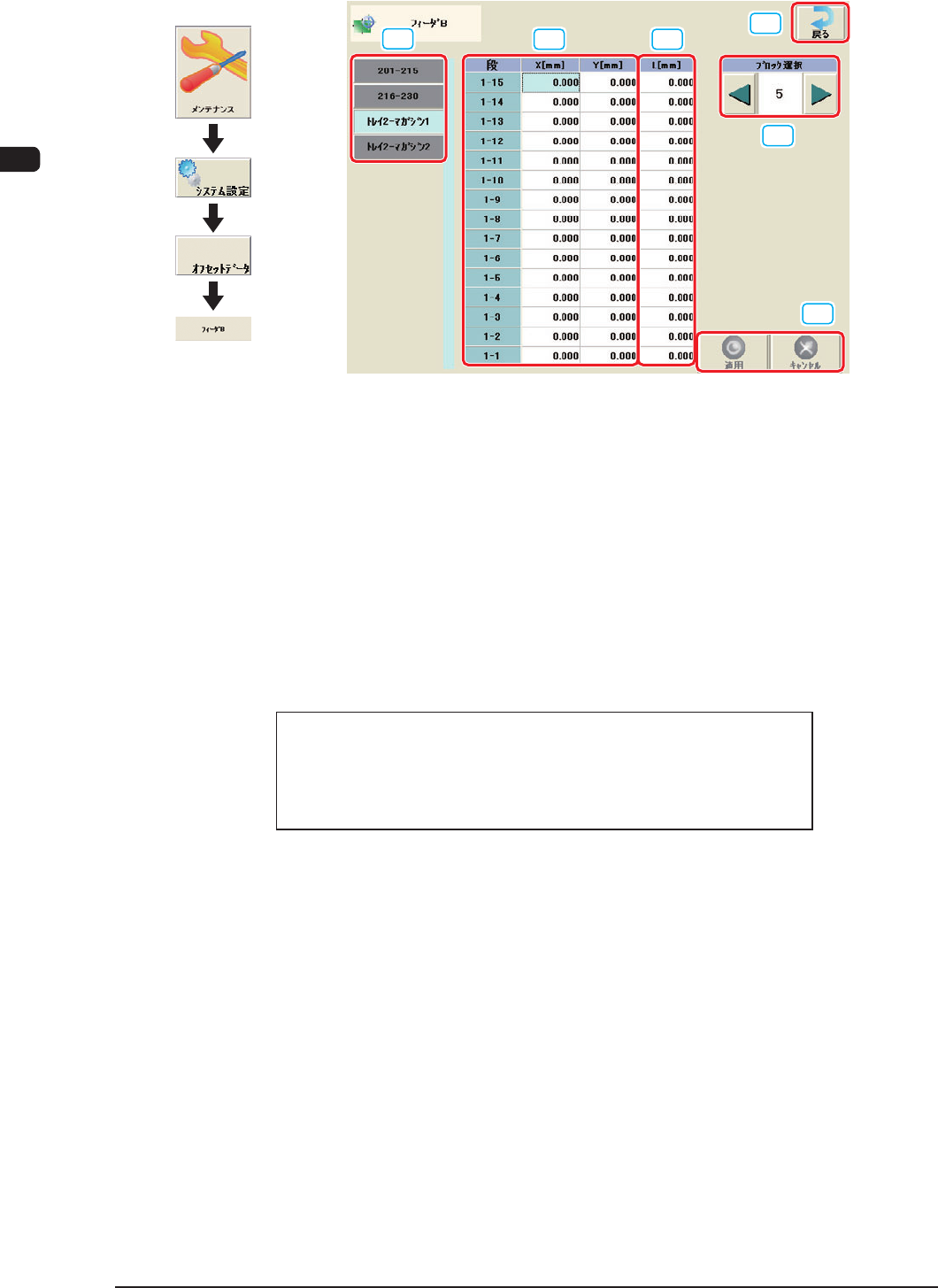 7OM-1601 3 章 2. システム設定メニュー 3-17 1003-002 [2] X( 横 )、Y( 縦 )[mm] 各フィーダ No ごとのフィーダ吸着位置の設計寸法に対する位置ズレ を調整するオフセットデータです。 F211 F111 後面フィーダ 前面フィーダ 装置手前側 Y(+) X(+) 吸着位置 吸着位置 F7C17 [3] L( 高 )[mm] 吸着基準レベル ノズル L(+) F7C18 オフセットに“+”の値を…