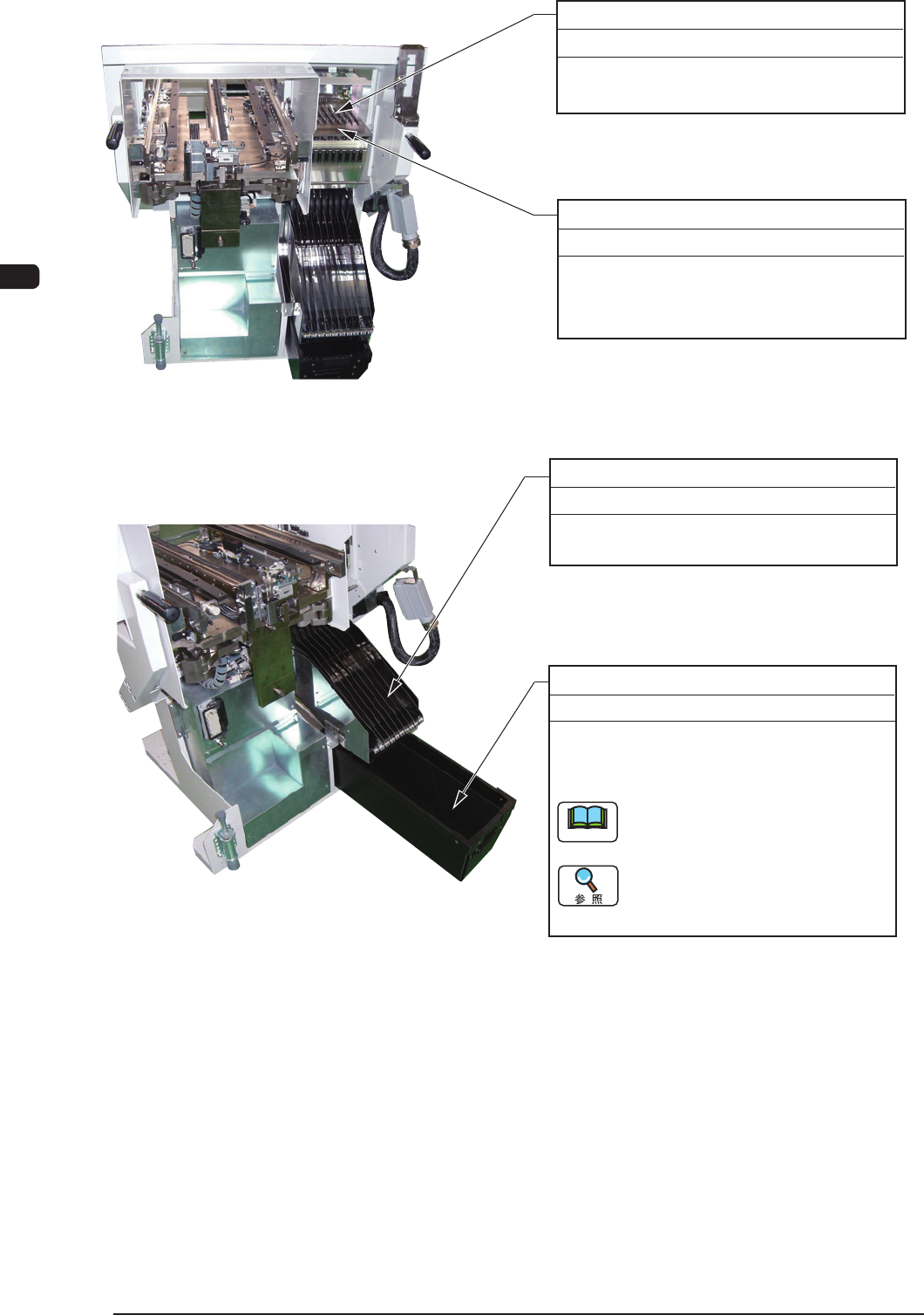 7OM-1601 4 章 3. メンテナンスか所 4-21 • パレットチャック保護カバーの取外し 手順 (1) 多段トレイフィーダを原点復帰させます。 (2) 電源を遮断します。 (3) 固定ネジ (M3L4)(2 か所 ) をプラスドライバで取外します。 警告 メンテナンス作業を行う場合、電源ブレーカを切り、南 京錠でロックしてください。 パレットチャック 保護カバー F7D14 • メンテナンスカバーの取付け パレットチャック保護…