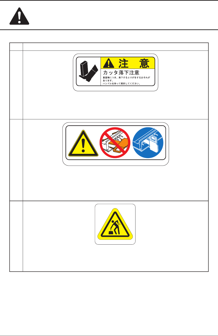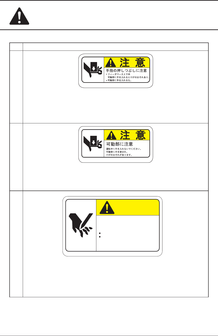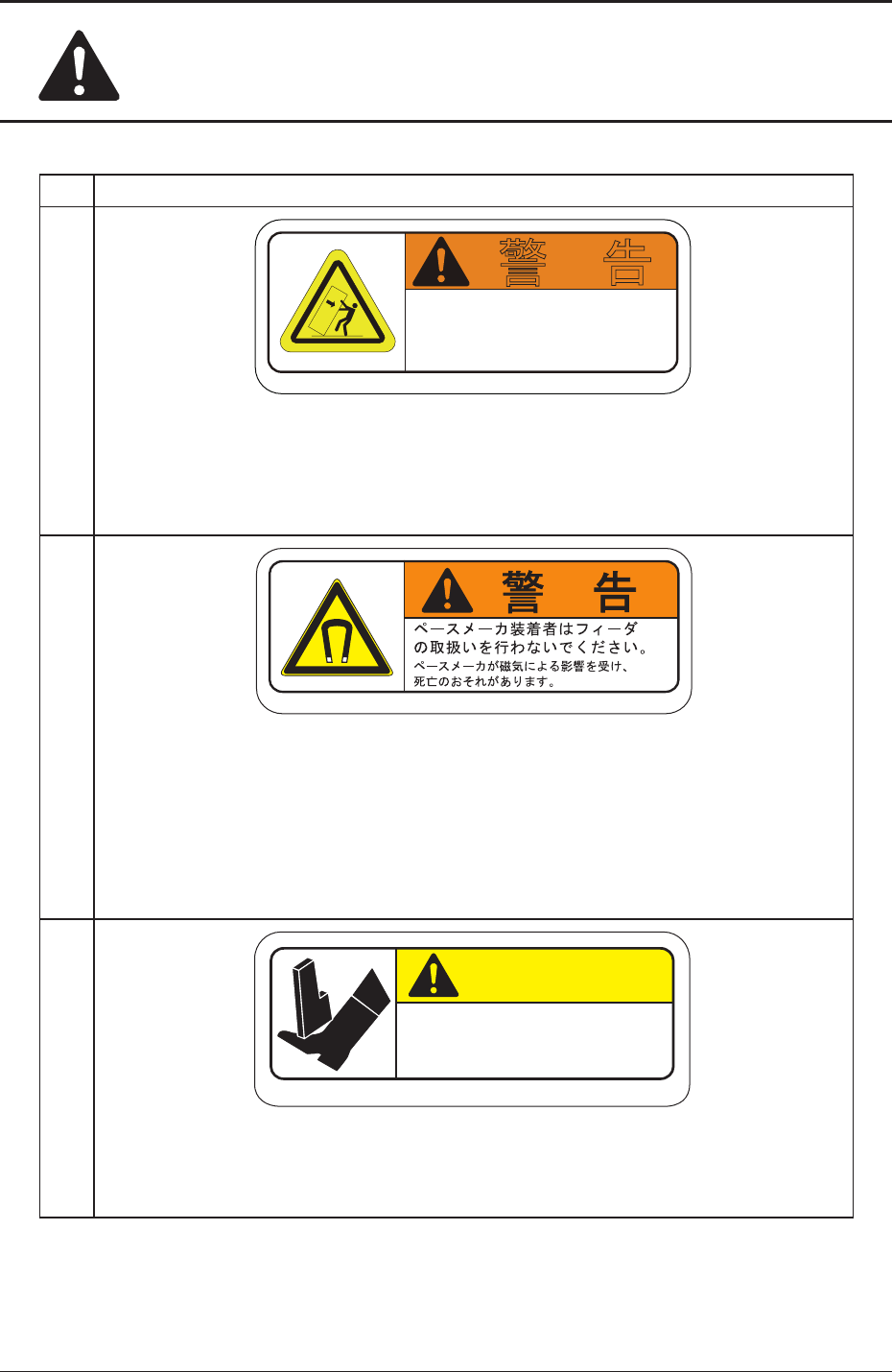 安全 -16 安全にお取扱いいただくために 7OM-1601 No 警告ラベルと説明 (10) 01-0231- 説 明  フィーダベース上下時に、可動部に手を入れないでください。 フィーダ準備完了スイッチの LED が点滅中は、フィーダベースが昇降し、 可動部にはさまれて、けがをするおそれがあります。 (11) 01-0282- 説 明  手を挟まれないように注意してください。 可動部にはさまれて、けがをするおそれがあります。 (…