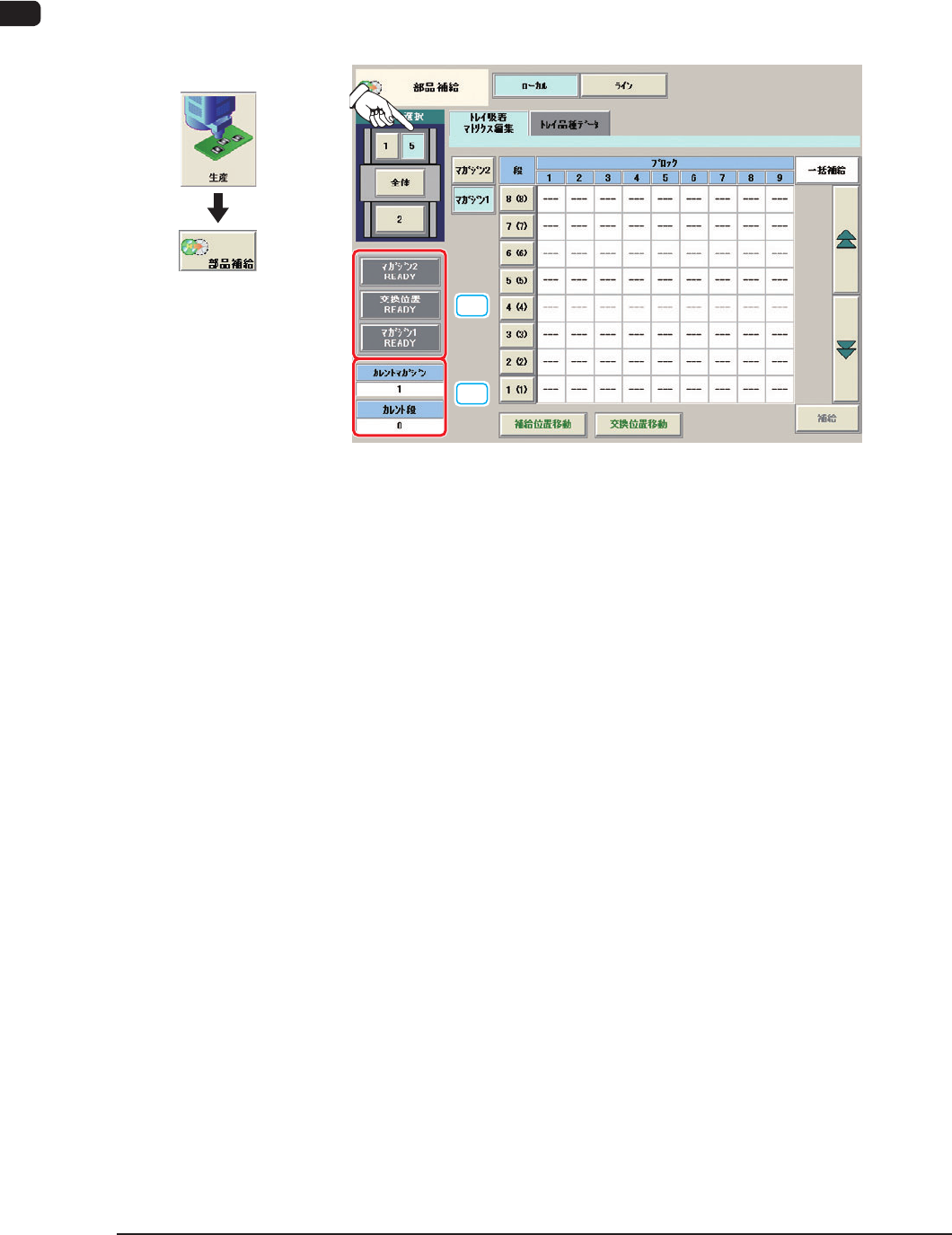 多段トレイフィーダ用の“部品補給”画面は“トレイ吸着マトリクス編集”