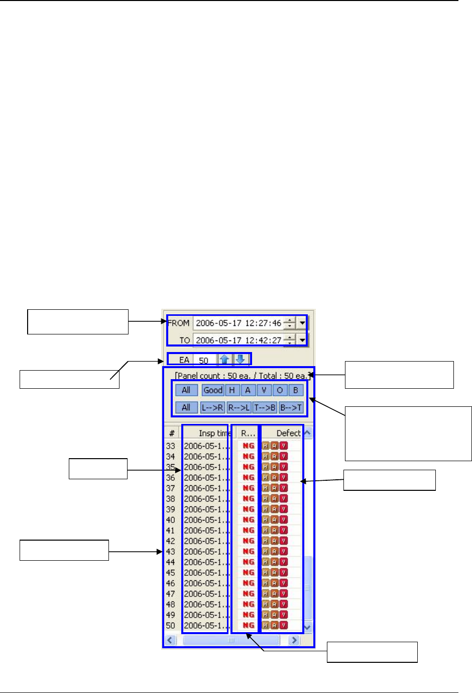 示内容是 1: 基板检测时刻 2: 基板不良内容详细显示.且最新检测基板信息显示在最下方。选择要