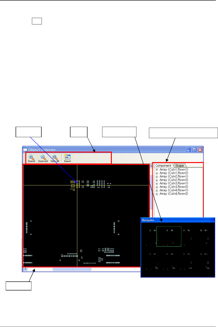 3. 统计 系 工程分 析和工程控制 PARMI CO ., LTD. 19 REV 1 .2 [ 图 3-15 ] 选择 工具 ① 放大 点击放大 按 键 时 , 整 画 面窗 的 各 pad 放大显示 . ② 缩小 点击缩小 按 键 时 , 整 画 面窗 的 p ad 缩 小 显示 . ③ 全 画 面 点击 全 画 面按 键 时,跟基板大 小1:1比例显 示 . ④ 数 据 导 出 pad 选择 后 E xpor t 按 键 点击时…