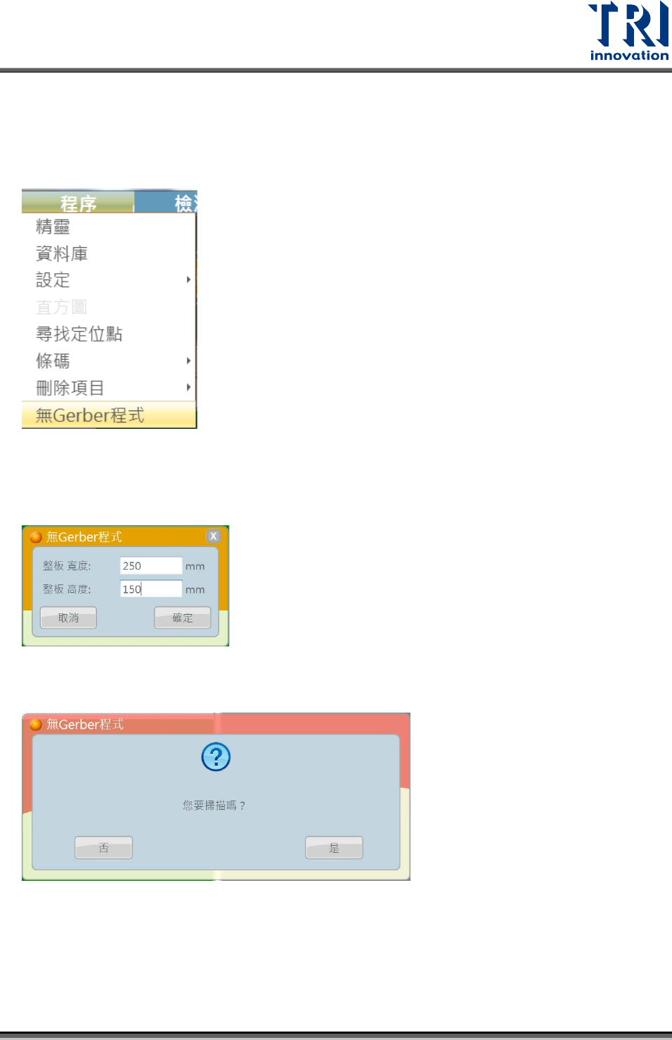 Test Research, Inc. 4.2.8 無 G ERBER 程式 無 Gerber 功能為進階測試功能。多用於 TRI 原廠塊規測試使用。下圖為無 Gerber 程式表單介面。 < 操作 範例 > 步驟 1. 點選無 Gerber 程式後,輸入板子尺寸並點擊 [ 確定 ] 按鈕。 步驟 2. 系統詢問是否掃描版子。點擊 [ 是 ] 按鈕,開始掃板取得板子影像。 TR 7007 Ser ies User Guide…
