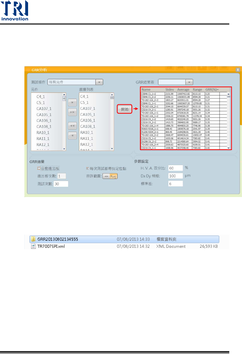 範例為使用 TR7007SPI.xml 執行 GRR 測試後,程式自動產生一個已 GRR 為