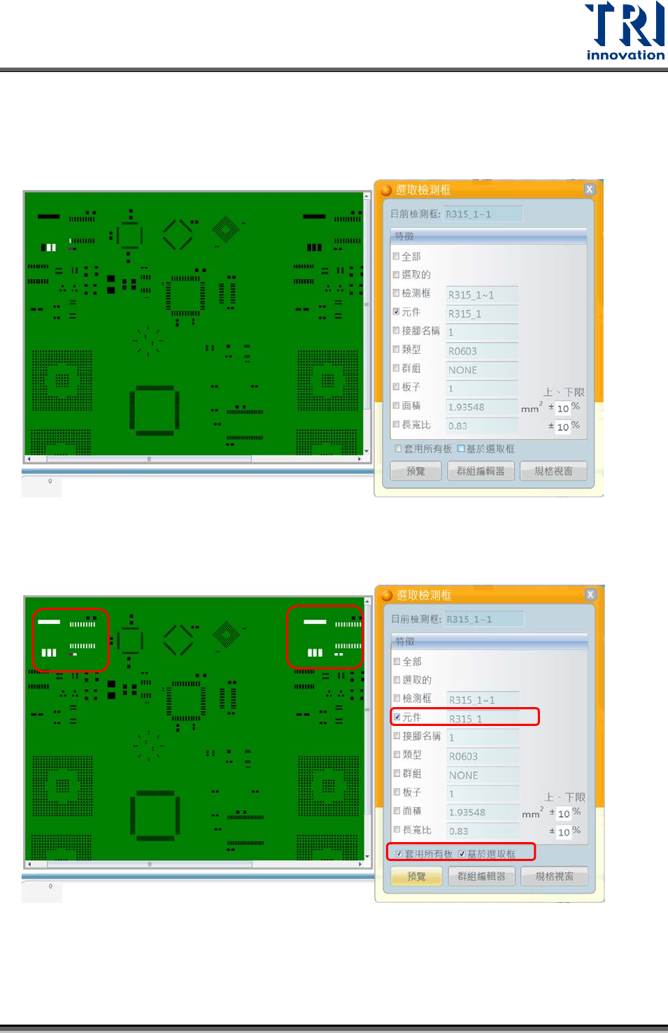 步驟1. 下圖圈選了三種元件(一共四個檢測框)。勾選元件、告用所有板、機於選取框