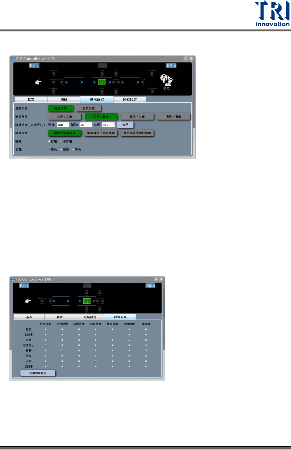 Test Research, Inc. 【進階設定】頁籤如下圖所示: 測試模式:包含連線模式、測試模式。圖例設定為連線模式。 進板方向:包含 左進左出、 左進右出、右 進左出、右進右 出。圖例 設定為 左進 / 右出。 流板速度 ( 毫米 / 秒 ) :可設定進 板 、減速、出版時 的速度 。設定後點擊 [ 套用 ] 按鈕即可。 條碼模式:包含機台外讀取條碼、進板後停止讀取條碼、機台外靜態讀取條碼。圖例 設定為機台外讀取條碼。 後站:可…