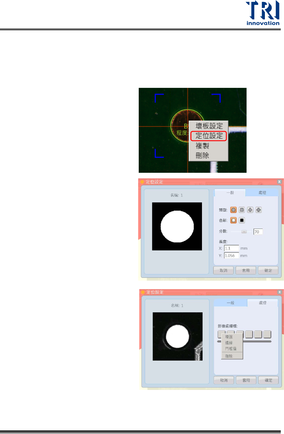 Test Research, Inc. 步驟 4. 選擇設定套用範圍。 Only Selected :僅套用在所選單板 All :套用至所 有單板上 步驟 5. 完成設定後,點選套用。 表格介紹: 板號: 顯示單板板號 門檻值:對位點影像的亮暗門檻值 影像分數:對位點影像與標準影像的比對分數 極性:勾選代表壞板標記設為-標記暗底板亮便忽略此板。 取消代表壞板標記設為-標記亮底板暗便忽略此板。 28 TR 7007 Ser ies…