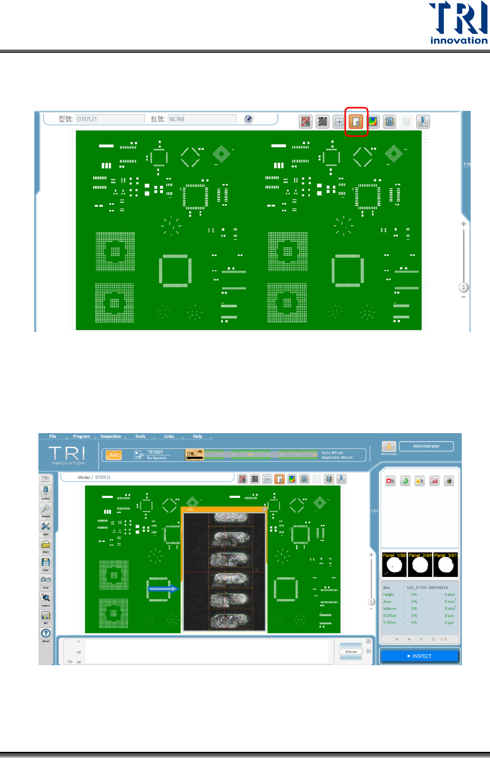 Test Research, Inc. 3.5 CA D 框 點擊 CAD 框圖示時,可看到 CAD 框位置分布圖 雙擊大圖上想檢視的地方, FOV 出現。 TR 7007 Ser ies User Guide – Softw are 39