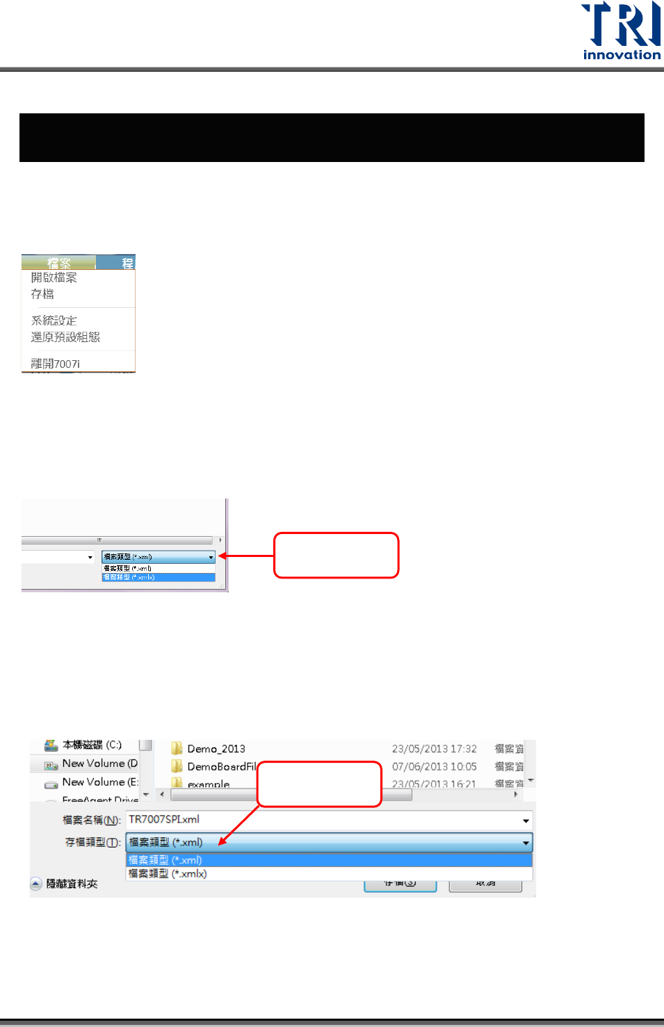 Test Research, Inc. 4 主程式選單介紹 4.1 檔案 檔案選單包含開啟檔案、存檔、系統設定、還元預設組態、離開 7007i ,共五項功能 選單。功能選單如下圖所示: 4.1.1 開啟檔案 點選開啟檔案功能 可 開啟格式為 xml 與 xml x 的兩種檔案 。 其中 預設可開啟格式 為 .xml 格式。如需開啟 .xmlx 格式,如下圖所示,可至視窗右下方切換將檔案類型。 4.1.2 存檔 存檔功能,選擇當前檔案名稱…
