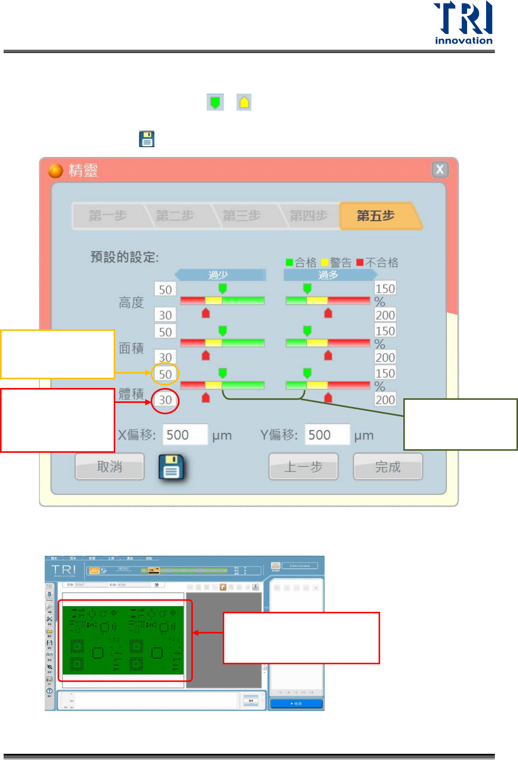 Test Research, Inc. 步驟 4 :選擇要套用的定位點 如下 圖所示 , 右側選項中可看到 .spi 檔中 所定義的全部定位點 。 左側選項預設使用 所 有定位點。使用 者選擇要討 用的定位 點,並確認 是否編輯 定位點後, 即可點選 [ 下一 步 ] 按鈕已完成此步驟。 選擇要套用的定 位點: 可使用上圖 中間的 [ 方向 ] 按鈕 決定檢測 時使用哪些 定位點,使 用 [+] 按鈕則可對定位點 進行編輯。 [ 方向 …