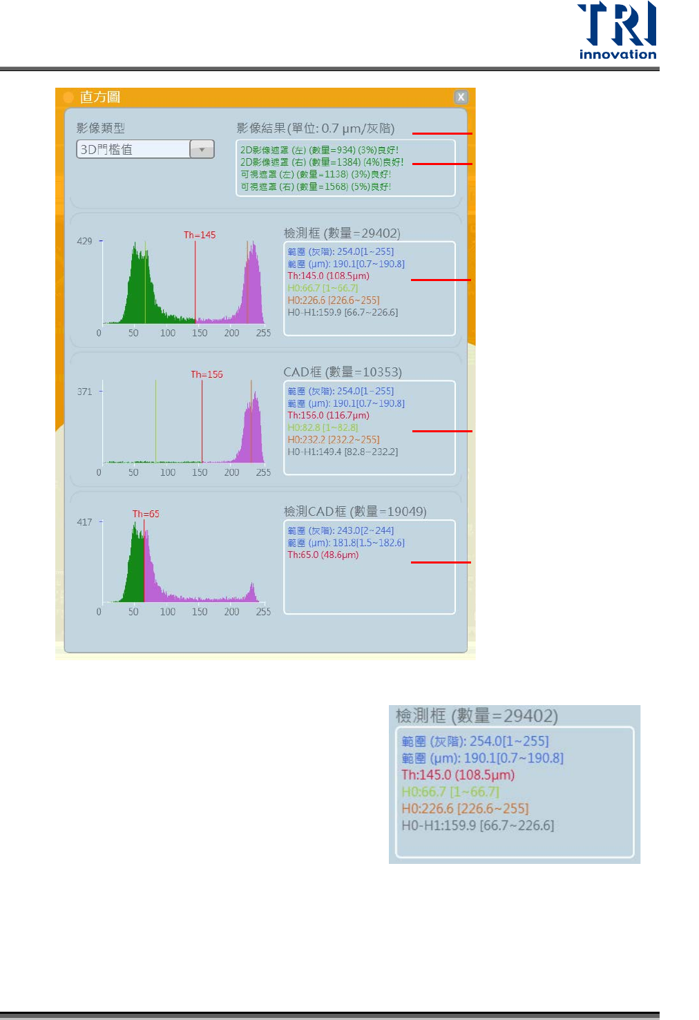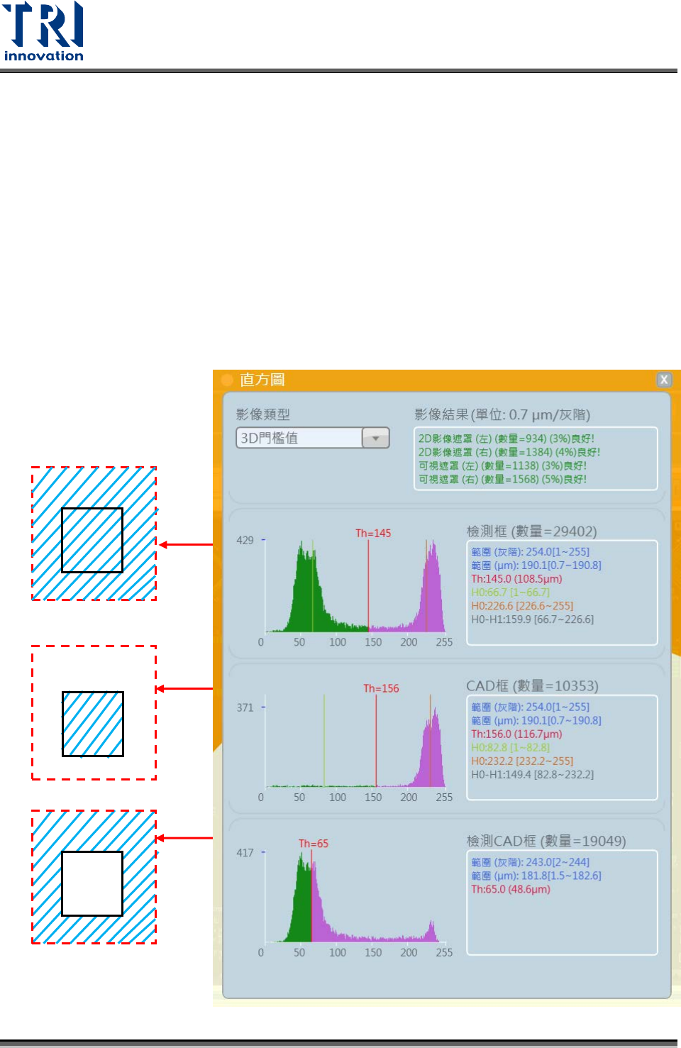 Test Research, Inc. 檢測框 ( 數量 ) :代表搜尋範圍內的 pixel 數 範圍 ( 灰階 ) :計算灰階最高數值值 範圍 (μm) :高度分佈範圍 Th :系統判定錫點與 Base 的門檻值。 H0 :系統判定 Base 的平均高度灰階數值。 H1 :系統判定錫膏的平均高度灰階數值。 H0- H1 :錫膏相對底板的高度。 越好的錫型會讓長條圖圖形越接近兩個尖銳的山峰,若有較小的錫點且錫型不好的 話則有可能產生只有…
