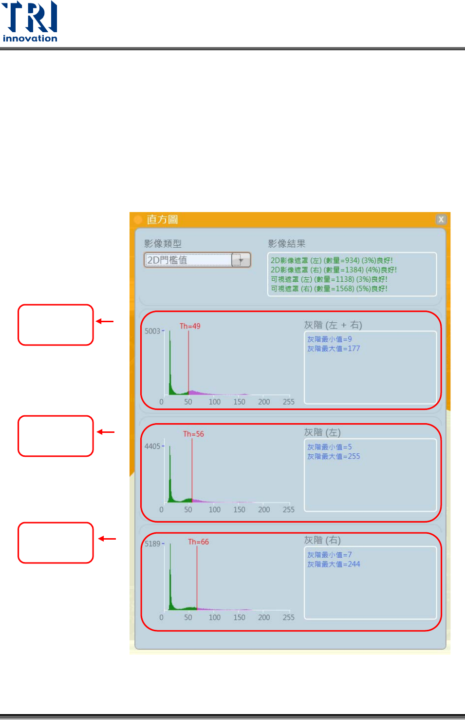 視窗中的 3 個長條圖由上而下依序是:1.左燈與右燈所取得的影像灰階值長條圖 2.僅