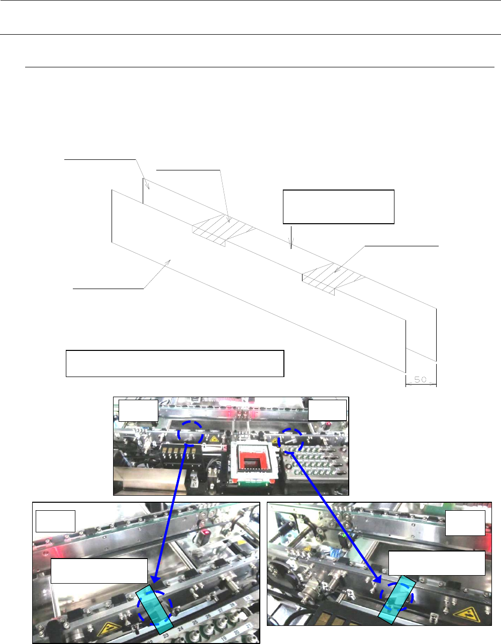 ② 把传送轨道宽度调整到最小(50mm),用纤维丝胶带把螺旋轴的上侧轨道板固定好。(2 处)