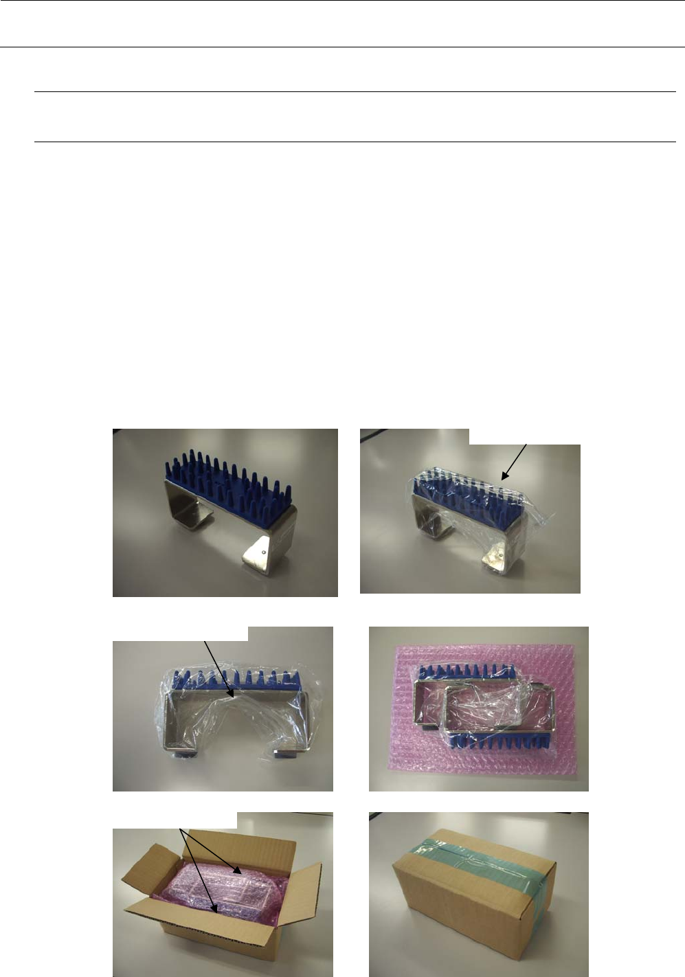 包装要领书 18 10-3. 左右两端部 ① 把轨板放到从主机突出的部分。 ② 按下图所示用气泡包装膜覆盖,以纤维丝胶带固定。 注意 ・ 请注意不能在轨道板(黑色部分)上施加任何负荷。 ・ 如果轨道板弄弯曲的话,机器就不能使用了。