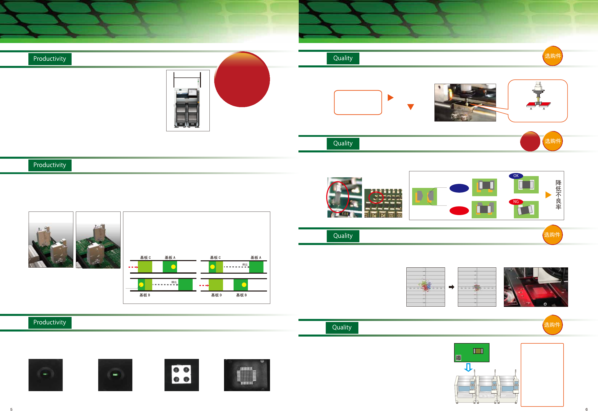 4 .High Flexibility 3 .High Quality 使用FCS调整夹具(另行购买)可以使贴片机对贴装位置的偏差进行自我识别、自我校正。 因此,不但可以维持更加稳定的贴装精度,而且使移动设备后的安装作业更加简单。 宽度虽然仅为 998mm,但实现了业界最高的 75,000CPH 的水平 元件贴装速度 ( 最佳条件) :75,000CPH 元件尺寸:03015 ~□ 5mm 0603 ~□ 25 ㎜ 标准装备双轨道传送结…