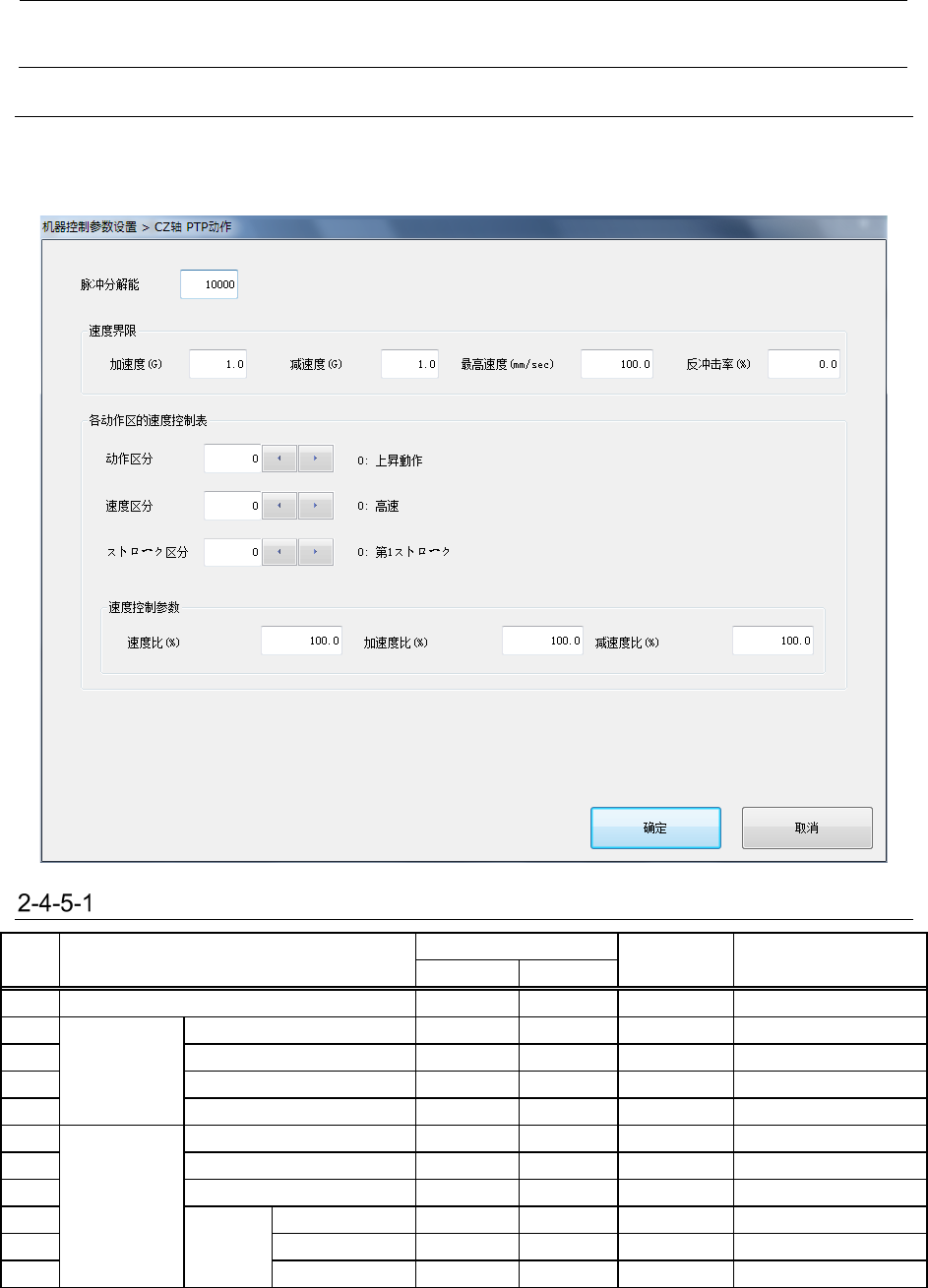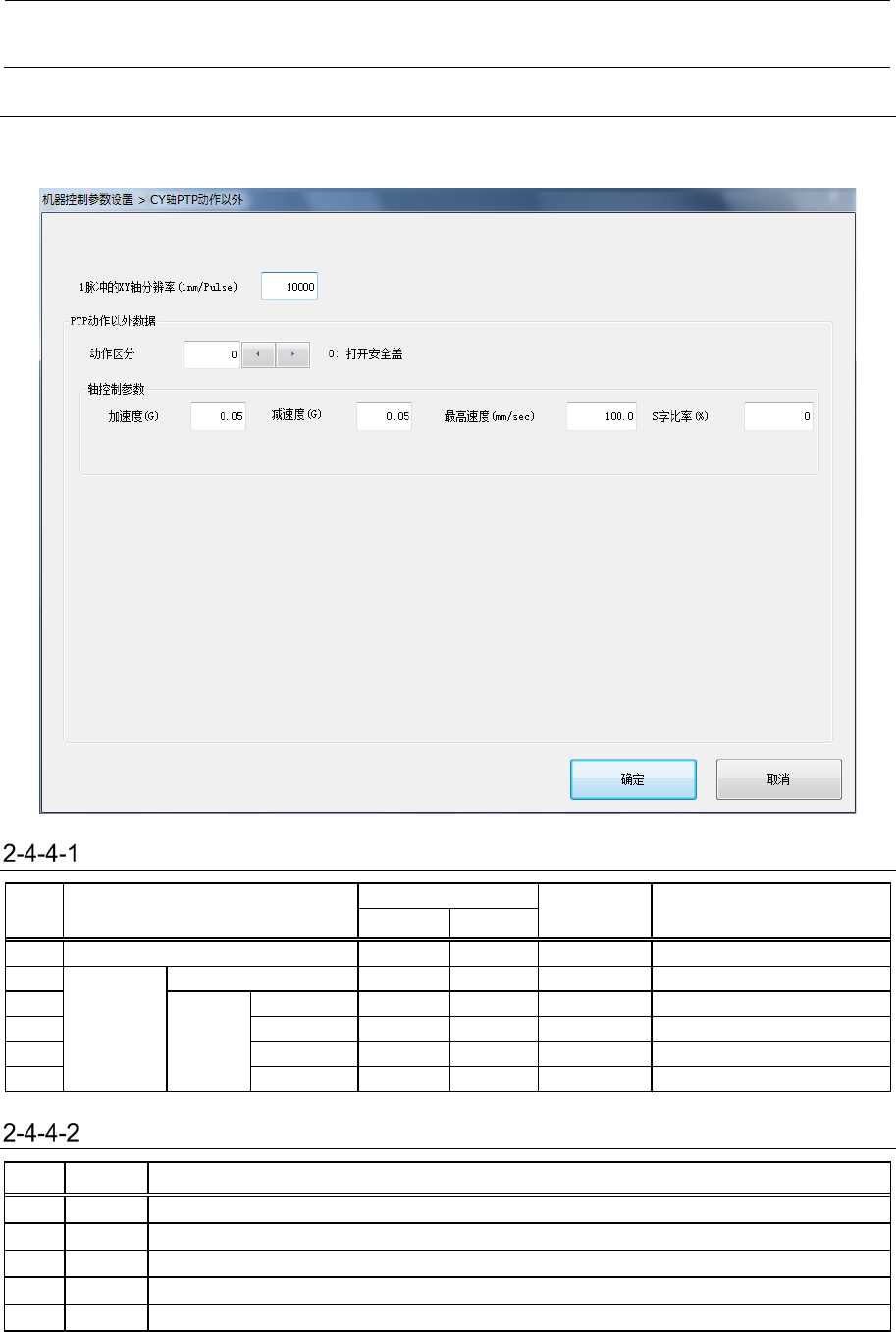 机器控制参数 2- 93 2-4-4 CY 轴 PTP 动作以外 将「动作区分」 设置在 要进行 编辑 的索引中时 ,可以按照设定 的区分编辑轴 控制参数。 设置项目 No. 项目 输入范围 单位 备考 最小值 最大值 1 1 脉冲的 XY 轴分辨率 nm / Puls e 2 PTP 动作 以外数据 动作区分 0 19 参照 2-4-4-2 动作区分 3 轴控制 参数 加速度 - 10 10 G 4 减速度 - 10 10 G 5 最…