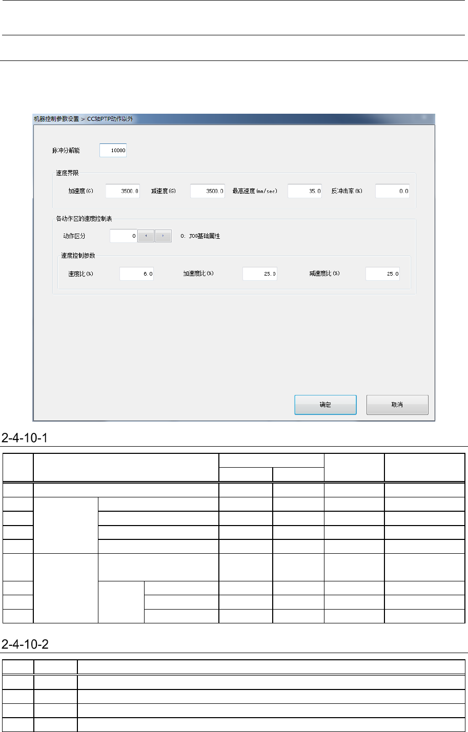机器控制参数 2- 104 2-4- 10 CC 轴 PTP 动作以外 可以编辑 脉冲分解能 及 速度 界限的 参数 。 将「动作区分」 设 置在要进行 编辑 的索引中时 ,可以按照设定 的区分编辑速 度控制参数。 设置项目 No. 项目 输入范围 单位 备考 最小值 最大值 1 脉冲分解能 nm/Pulse 2 速度界限 加速度 - 1000000 1000000 G 3 减速度 - 1000000 1000000 G 4 最高速度 …