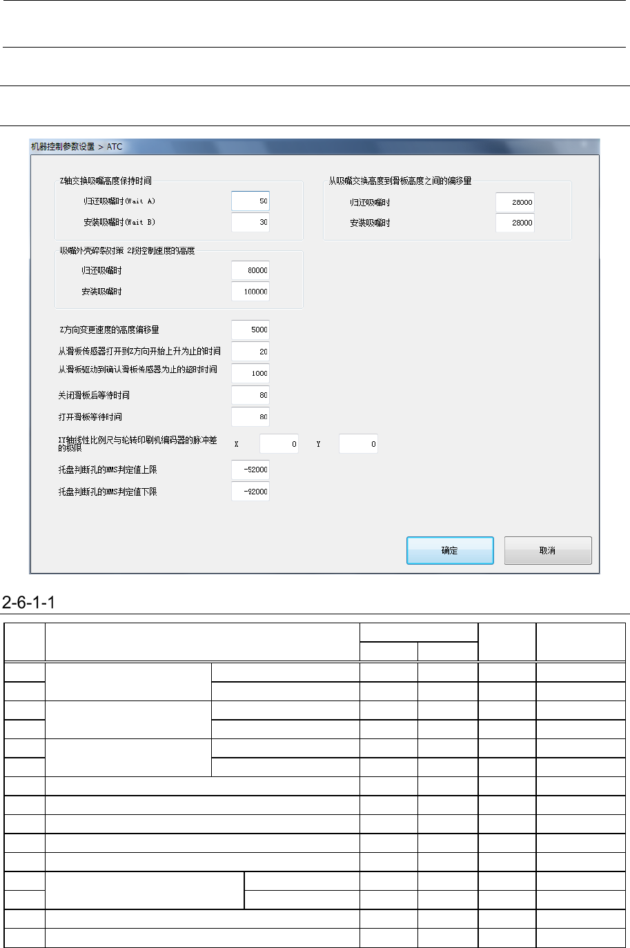 机器控制参数 2- 11 6 2-6 单元 2-6-1 ATC 设置项目 No. 项目 输入范围 单位 备考 最小值 最大值 1 Z 轴交换吸嘴高度停留时 间 归还吸嘴时( Wait A ) 2 安装吸嘴时( Wait B ) 3 吸嘴外壳碎裂 对策 2 段控 制速度的高度 归还吸嘴时 4 安装吸嘴时 5 从吸嘴高度到滑板高度之 间的偏移量 归还吸嘴时 6 安装吸嘴时 7 Z 方向变更速度的高度偏 移量 8 从滑板传感器打开到 Z 方向…