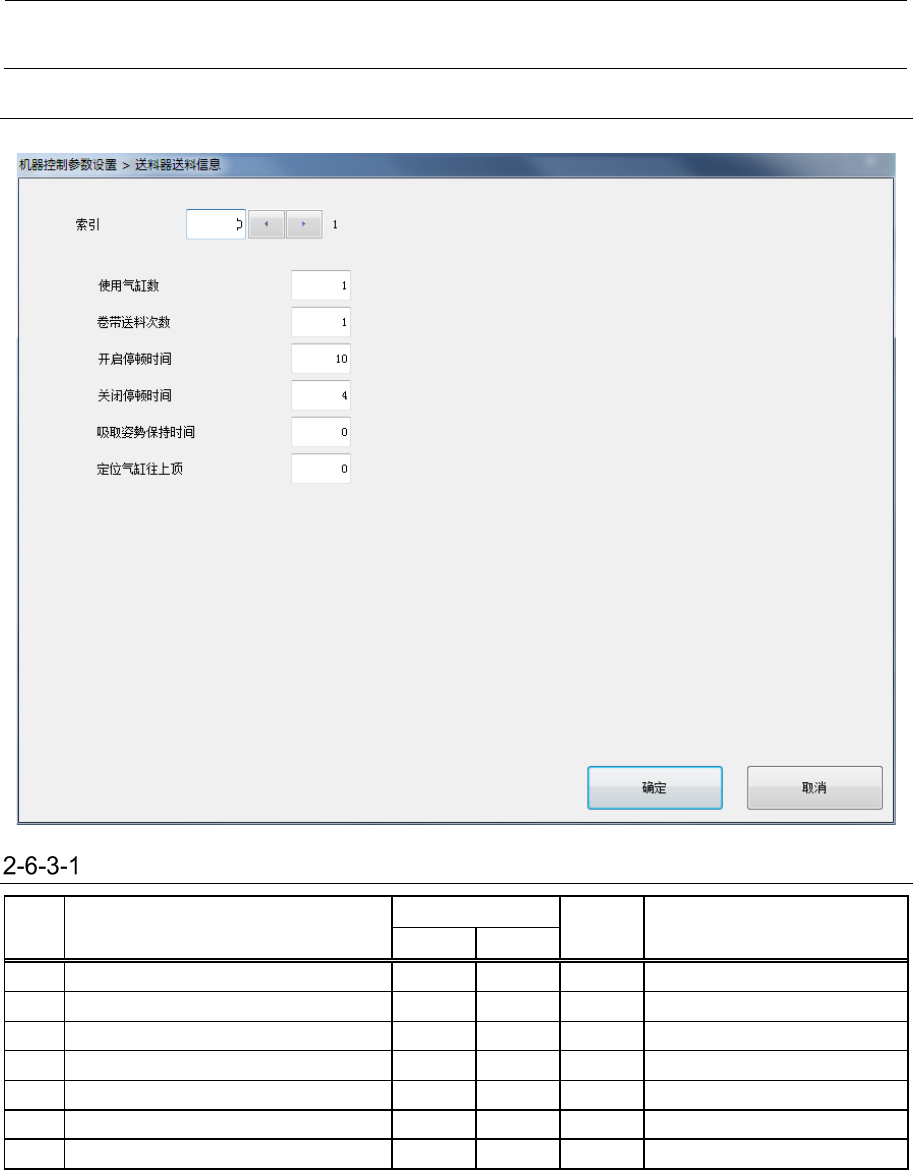 机器控制参数 2- 11 8 2-6-3 送料器送料信息 设置项目 No. 项目 输入范围 单位 备考 最小值 最大值 1 索引 0 49 2 使用气缸数 0 255 3 卷带送料次数 0 255 4 开启停顿时间 0 255 5 关闭停顿时间 0 255 6 吸取姿势停留时间 0 255 7 定位气缸往上顶 0 255