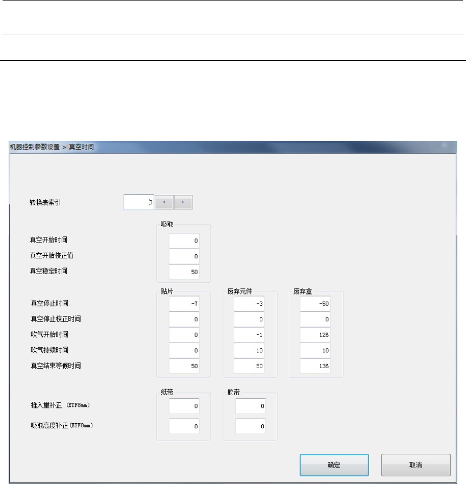 机器控制参数 2- 20 设置项目 No. 项目 输入范围 单位 备考 最小值 最大值 1 转换表索引 0 49 参照 2-1-9-2 转换 表索引 2 吸取 真空开始时间 3 真空开始校正值 4 真空稳定时间 5 贴片 真空停止时间 6 真空停止校正时间 7 吹气开始时间 8 吹气持续时间 9 真空结束等候时间 10 废弃元件 真空停止时间 11 真空停止校正时间 12 吹气开始时间 13 吹气持续时间 14 真空结束等候时间 15 …