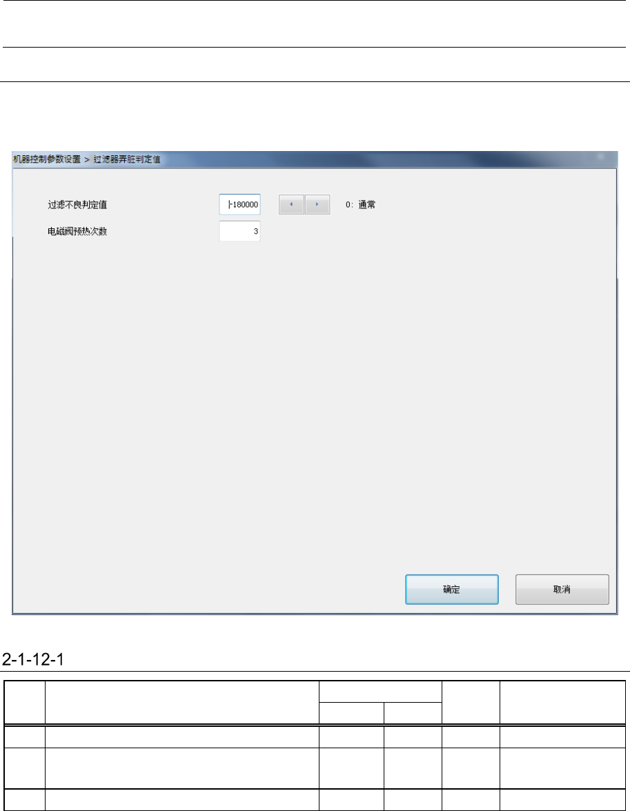 机器控制参数 2- 25 2-1- 12 过滤器弄脏判定值 如将“过滤不良判定值 ” 的索引设置为欲编辑的索引,即可对所设定的区分 中的过滤不良 判定 值 进行编辑。 设置项目 No. 项目 输入范围 单位 备考 最小值 最大值 1 过滤不良判定值 2 过滤不良判定值(类别 ) 0 2 0 :通常 1 ~ 2 :扩展 3 电磁阀预热次数 0 255