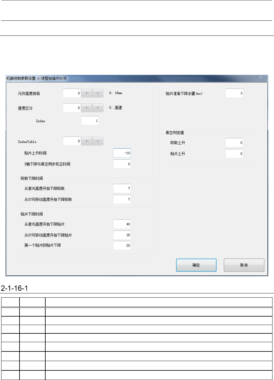 机器控制参数 2- 32 速度区分 设置项目 No. 项目 输入范围 单位 备考 最小值 最大值 1 贴片上升时间 - 32768 32767 ms 2 Z 轴下降与真空同步校正 时间 - 32768 32767 ms 3 从激光高度开始下降吸 取 - 32768 32767 ms 4 从 XY 可移动高度开始下 降吸取 - 32768 32767 ms 5 从激光高度开始下降贴 片 - 32768 32767 ms 6 从 XY 可移…