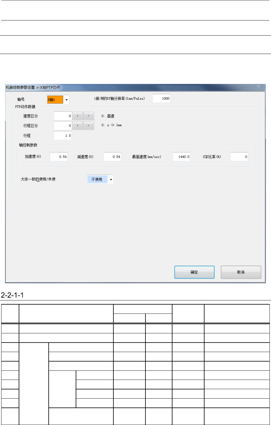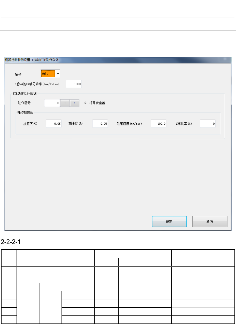 机器控制参数 2- 37 轴号 速度区分 行程区分 No. 类别 内容 1 0 X 轴 1 No. 类别 内容 1 0 高速 2 1 中速 3 2 低速 4 3 低速 2 5 4 高速 2 6 5 ~ 9 预备 No. 类别 内容 1 0 s <= 1mm 2 1 1mm < s <= 2mm 3 2 2mm < s <= 4mm 4 3 4mm < s <= 10mm 5 4 10mm <…